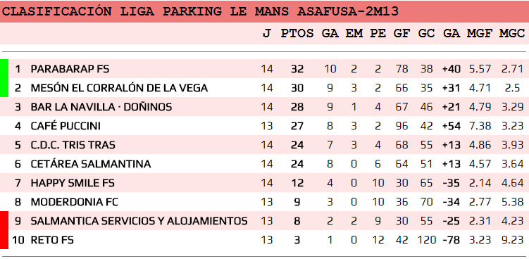 Decimocuarta jornada en la Liga Parking Le Mans, en la que destaca una nueva victoria del CORRALÓN DELA VEGA, frente a HAPPY SMILE FS, por 7-1. Con estos tres puntos más, consiguen el segundo puesto, y se colocan a dos puntos del primero. El PARABARAP FS venció 3-9 al último, RETO FS, y continúan líderes en la clasificación.