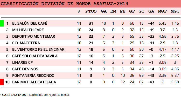 Jornada sin sorpresas en la División de Honor Asafusa-2M13, donde los equipos mejor clasificados, vencieron en sus encuentros contra el contrario. El CAFÉ SOLO ALDEADAVILA, tuvo dos partidos que jugar, que los resolvió con una derrota, frente al MH HEALTH CARE por 2-0, y con una victoria contra el colista BAR MATI ALDEATEJADA por 4-1 donde Alejandro Duque marcó dos de esos goles.