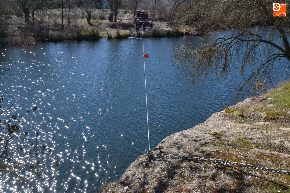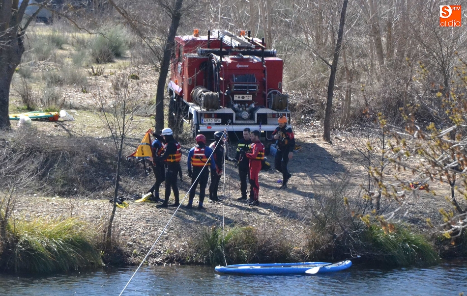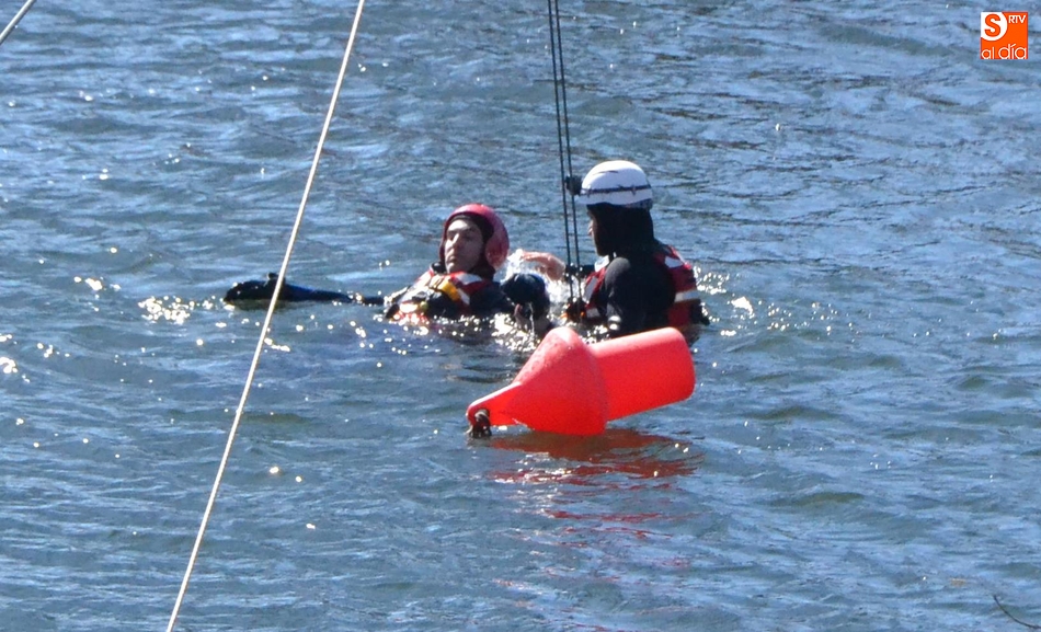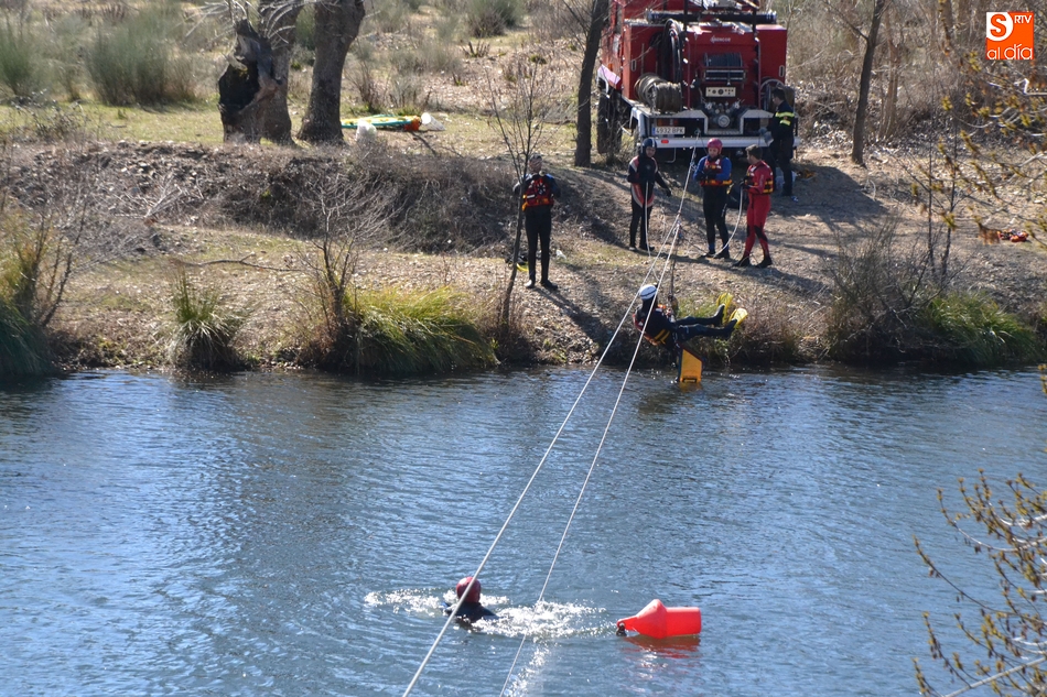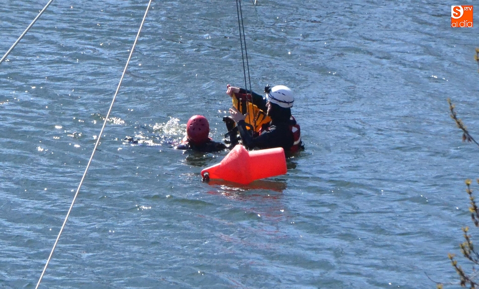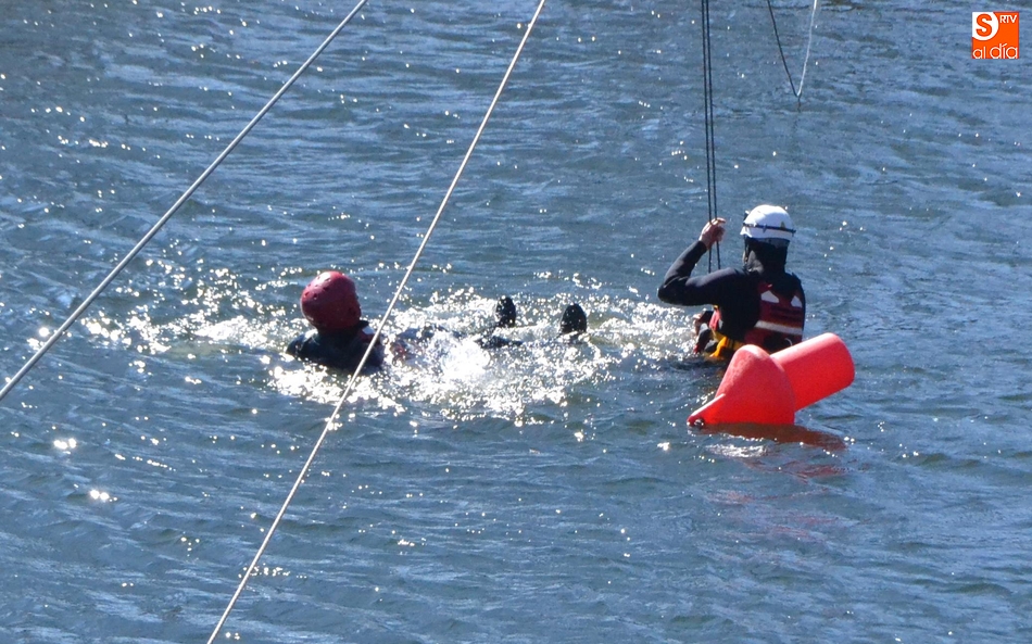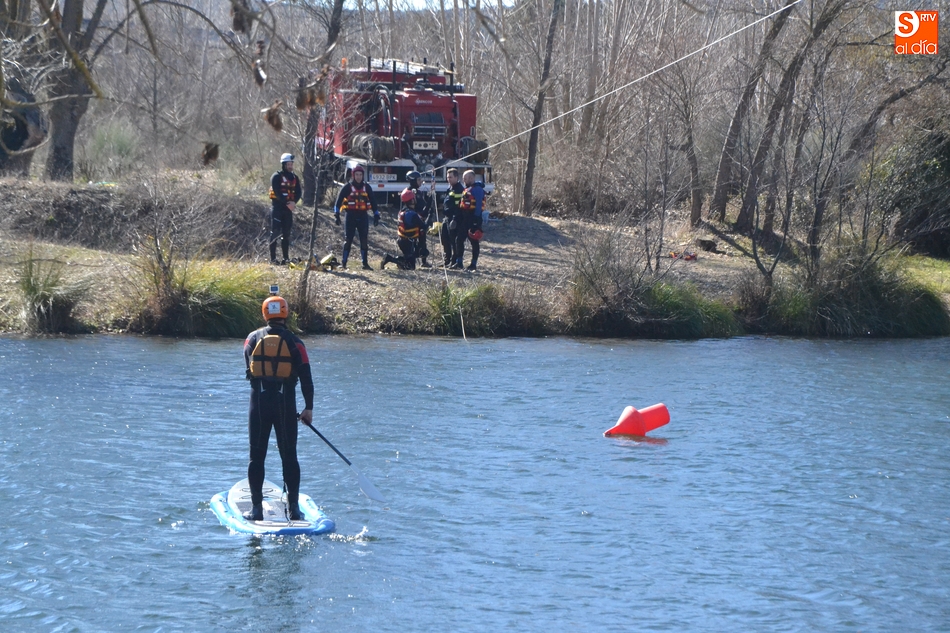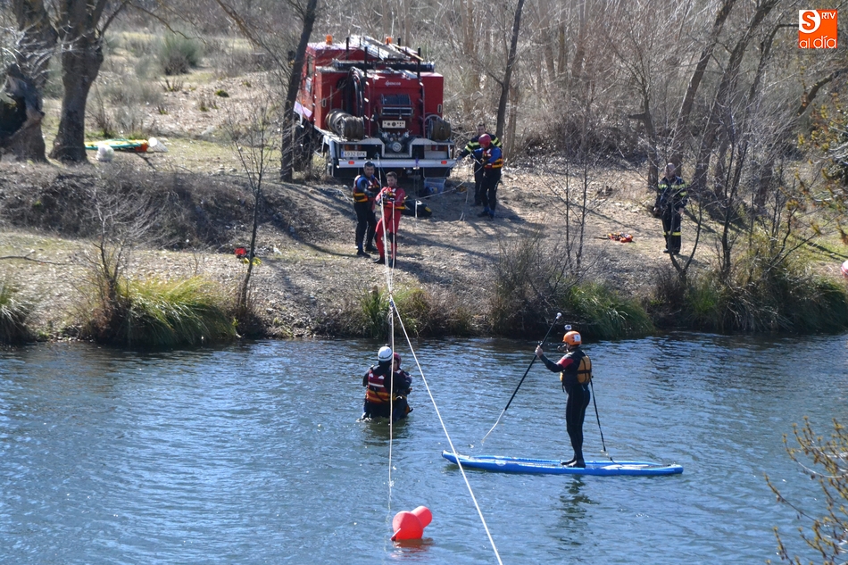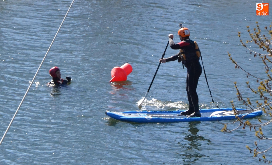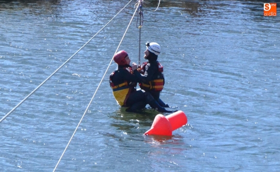 Las aguas del río Águeda a su paso por Ciudad Rodrigo acogieron en la mañana del miércoles, por segundo día consecutivo, una sesión de prácticas del curso de rescate y salvamento en riadas e inundaciones que están recibiendo durante esta semana integrantes del Parque de Bomberos mirobrigense.