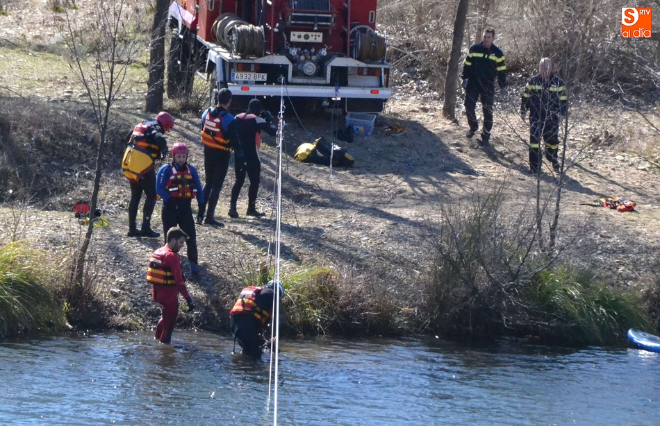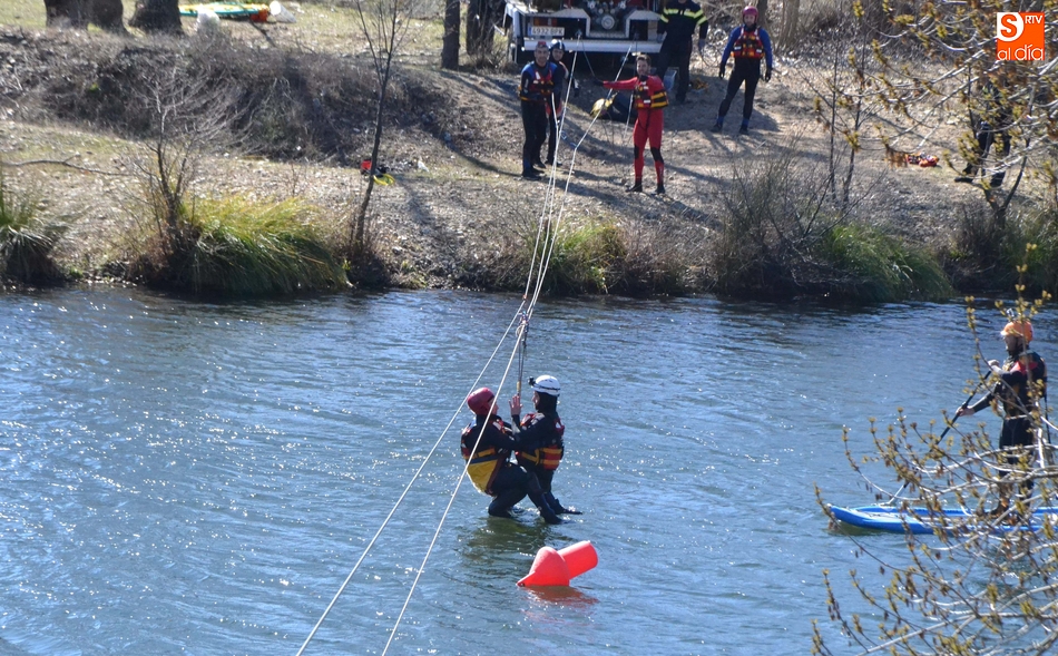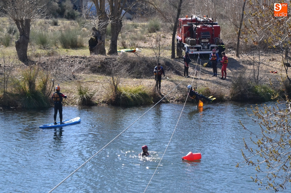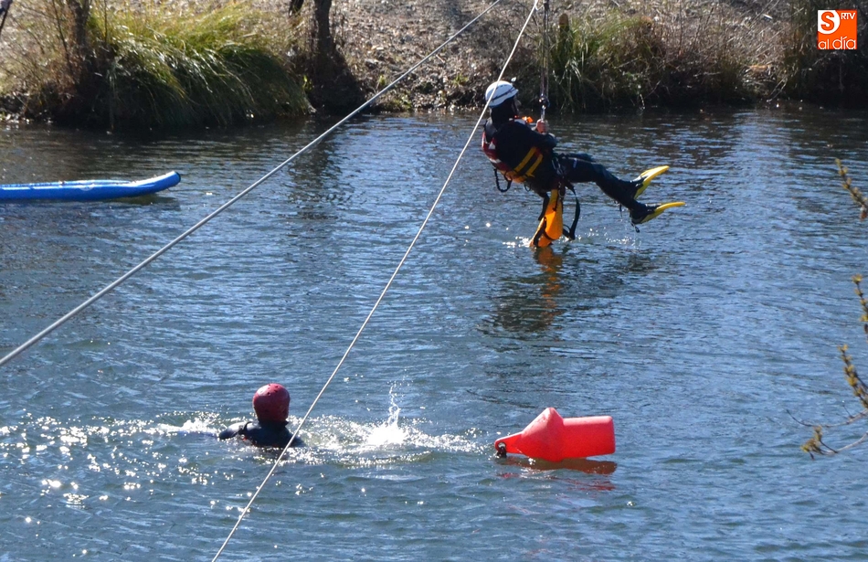 Para llevar a cabo esta nueva jornada, los Bomberos se repartieron en ambas orillas, desplegando una serie cuerdas de una orilla a otra, para poder llegar deslizándose como en una tirolina a la mitad del cauce del río, donde estaba la persona a rescatar (aunque evidentemente contaba con traje de neopreno, le tocó sufrir la baja temperatura del agua).