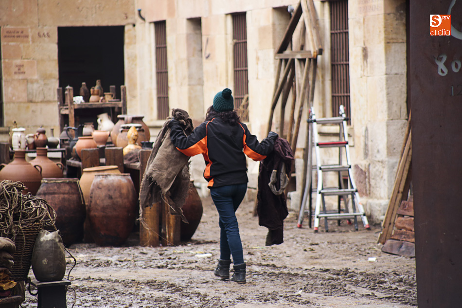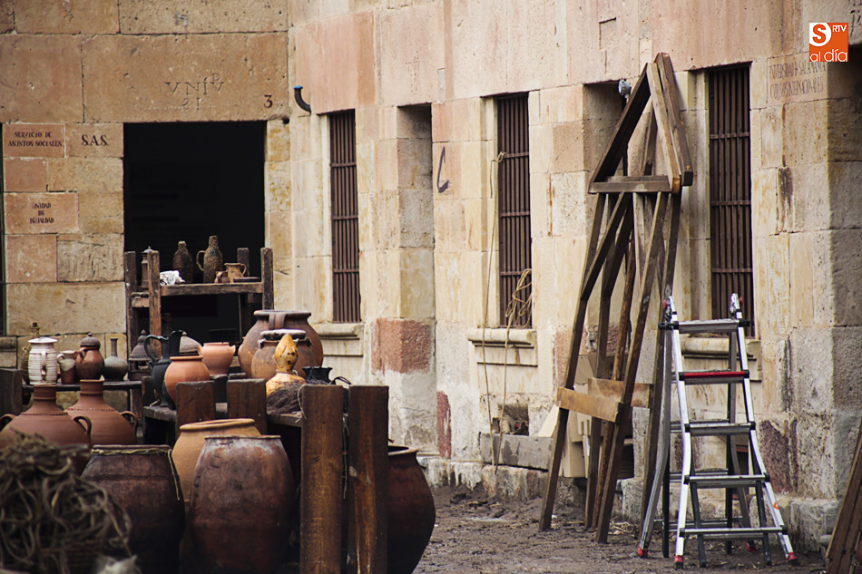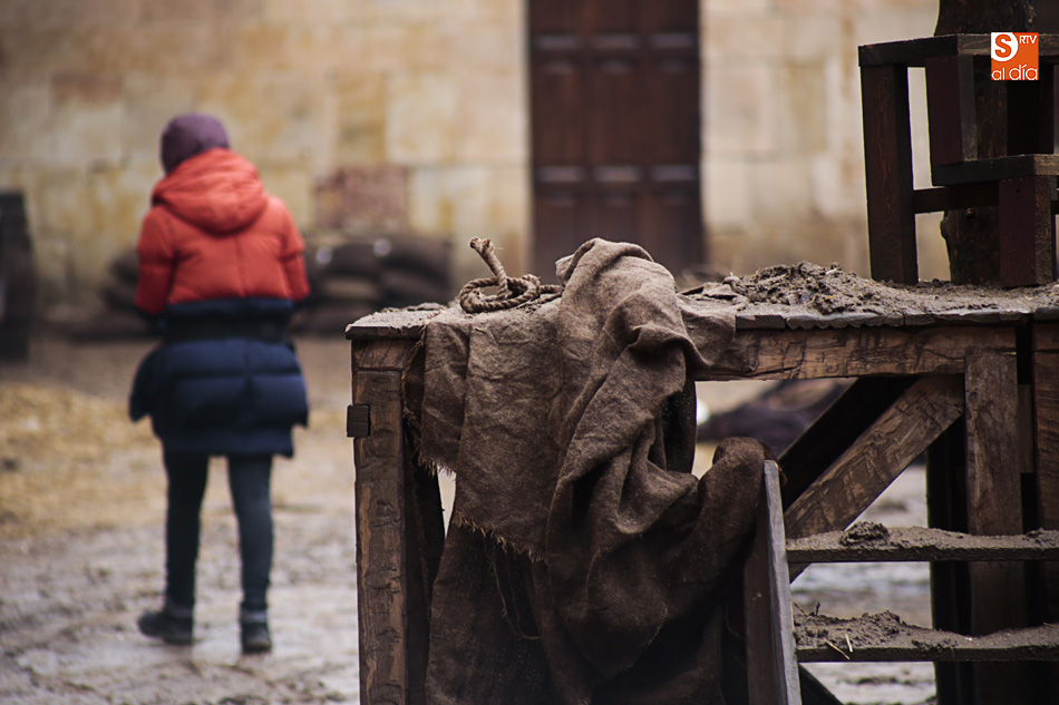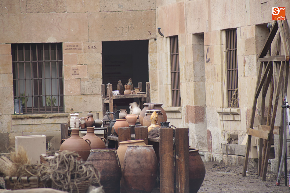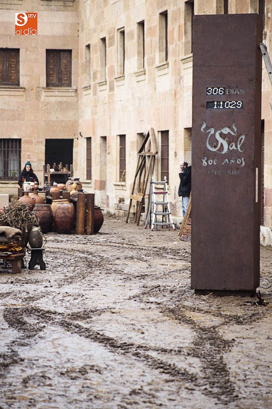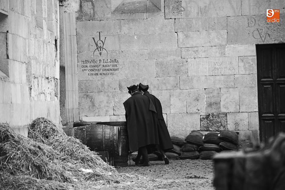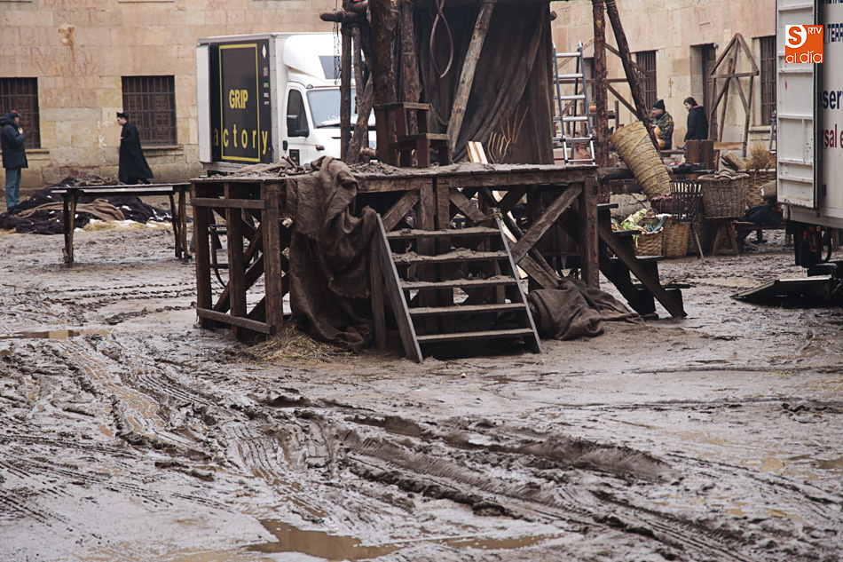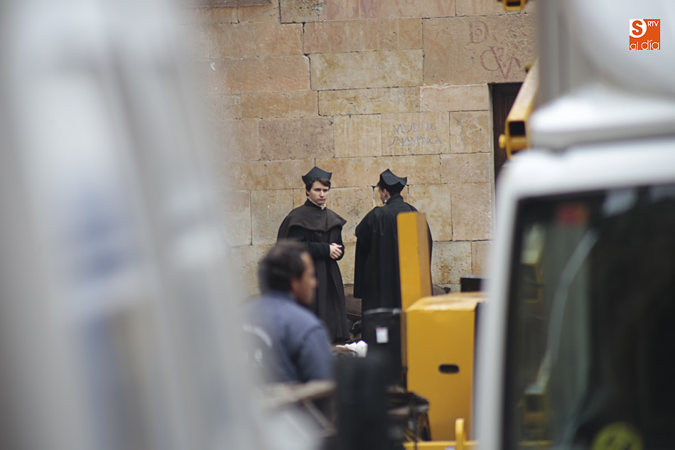 El Patio de Escuelas se ha transformado con motivo del rodaje de algunas escenas de la película para televisión sobre Fray Luis de León, que coincidirá con el VIII centenario de la que es la universidad más antigua de España. Además, la lluvia ha transformado este espacio en un barrizal, puesto que el suelo estaba cubierto de tierrra,