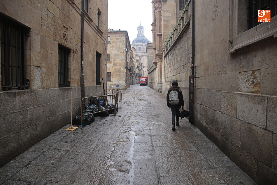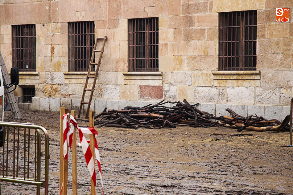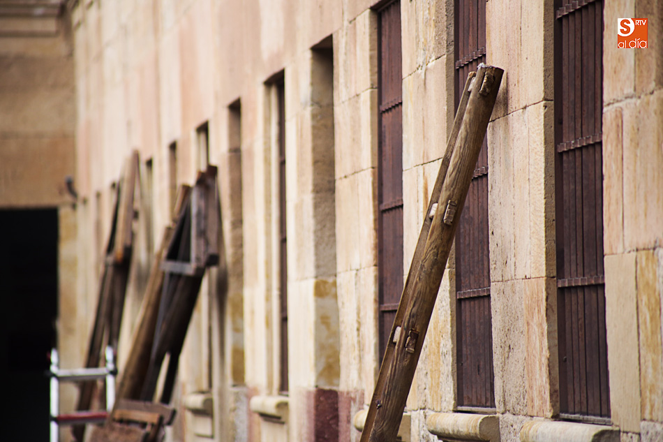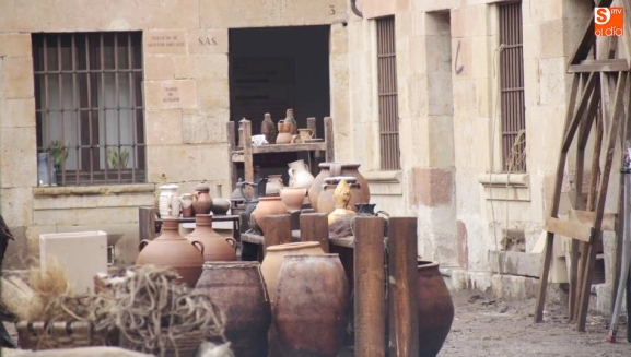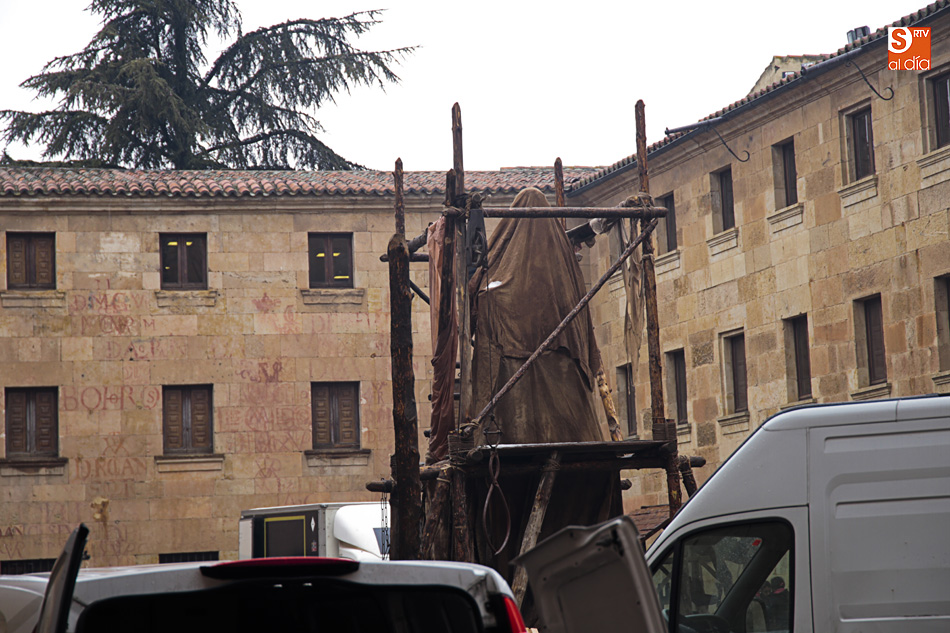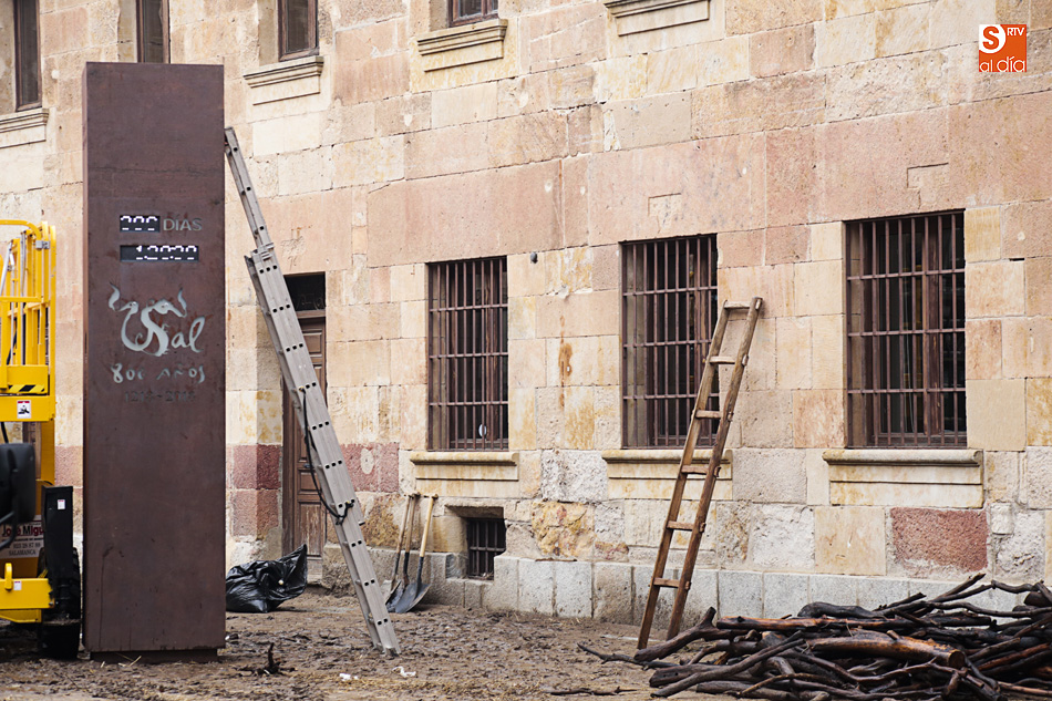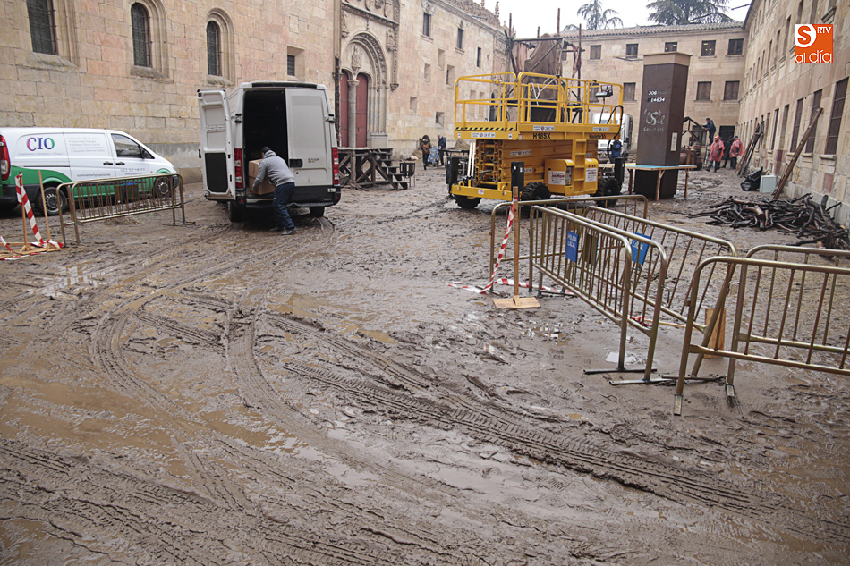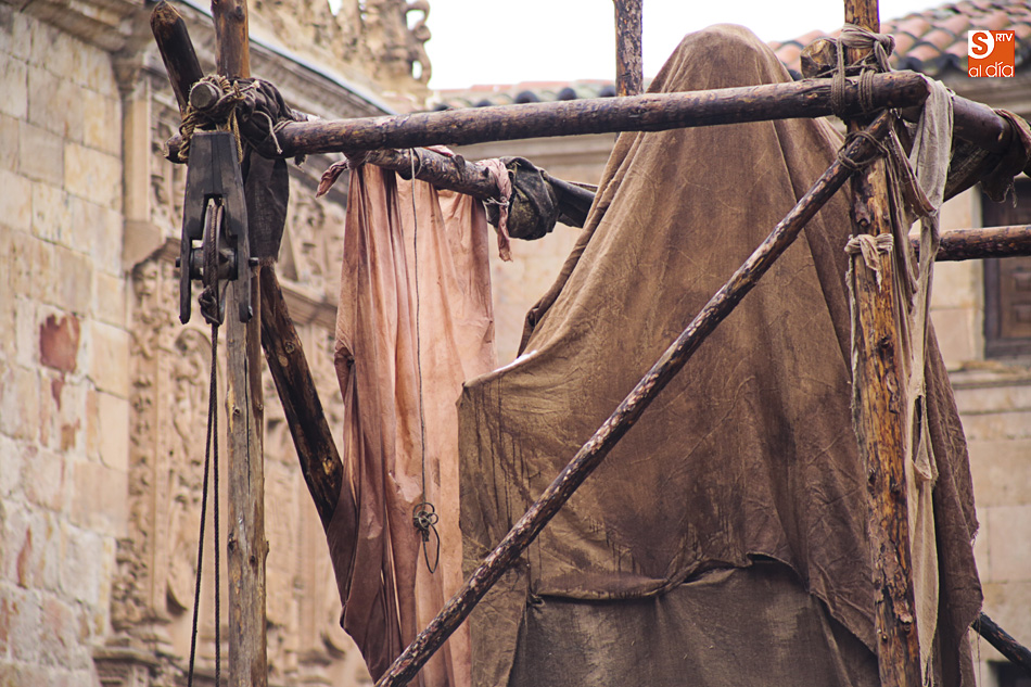 El Patio de Escuelas se ha transformado con motivo del rodaje de algunas escenas de la película para televisión sobre Fray Luis de León, que coincidirá con el VIII centenario de la que es la universidad más antigua de España. Además, la lluvia ha transformado este espacio en un barrizal, puesto que el suelo estaba cubierto de tierrra,