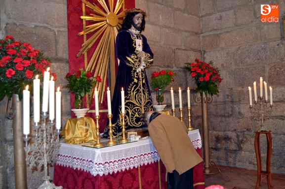 Nadie ha querido dejar pasar la oportunidad de cumplir con la tradición y, a pesar del mal tiempo protagonista del viernes, han sido cientos los fieles que han mostrado su fe a la imagen de Jesús de Medinaceli durante su besa pies celebrado en la iglesia parroquial San Miguel Arcángel. Desde las 11 de la mañana los devotos han visitado el templo para ofrecer sus oraciones y peticiones a esta venerada imagen nazarena, tras lo que se producía el sentido gesto, entre un respe