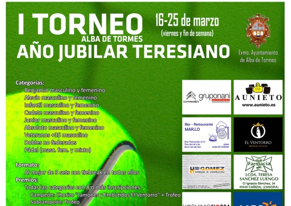 El Club Deportivo Tenis Alba de Tormes organiza en las próximas semanas su primer torneo del año 2018. Bajo la batuta de Alberto Rodríguez y Sandra Sabroso, todos los torneos organizados por el club durante este año contarán con la denominación 'Año Jubilar Teresiano'.
