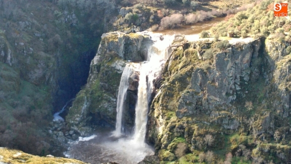 Las intensas lluvias registradas en los últimos días se deja notar en estampas como la que ofrece el Pozo de los Humos, en pleno Parque Natural Arribes del Duero, una espectacular vista desde Pereña de la Ribera que refleja el aumento del caudal de su cascada natural, tan necesario como esperado.