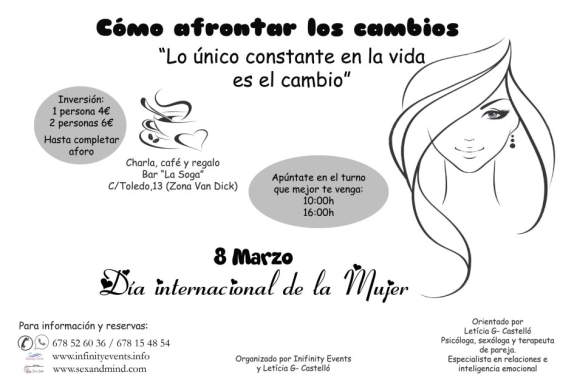 El próximo 8 de marzo, y con motivo del Día Internacional de la Mujer, el Bar La Soga, en la calle Toledo 13, en la zona de Van Dyck, acogerá unas tertulias y charlas organizadas por Infinity Events y que tendrán como protagonista a Leticia García Castelló, psicóloga, sexóloga, terapeuta de pareja, especialista en relaciones e inteligencia emocional, que orientará a las mujeres presentes sobre cómo afrontar los cambios que se sufren, porque como apunta "lo único constante en la vida es el cambio".