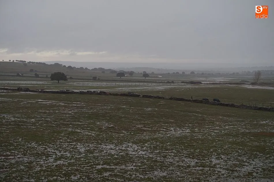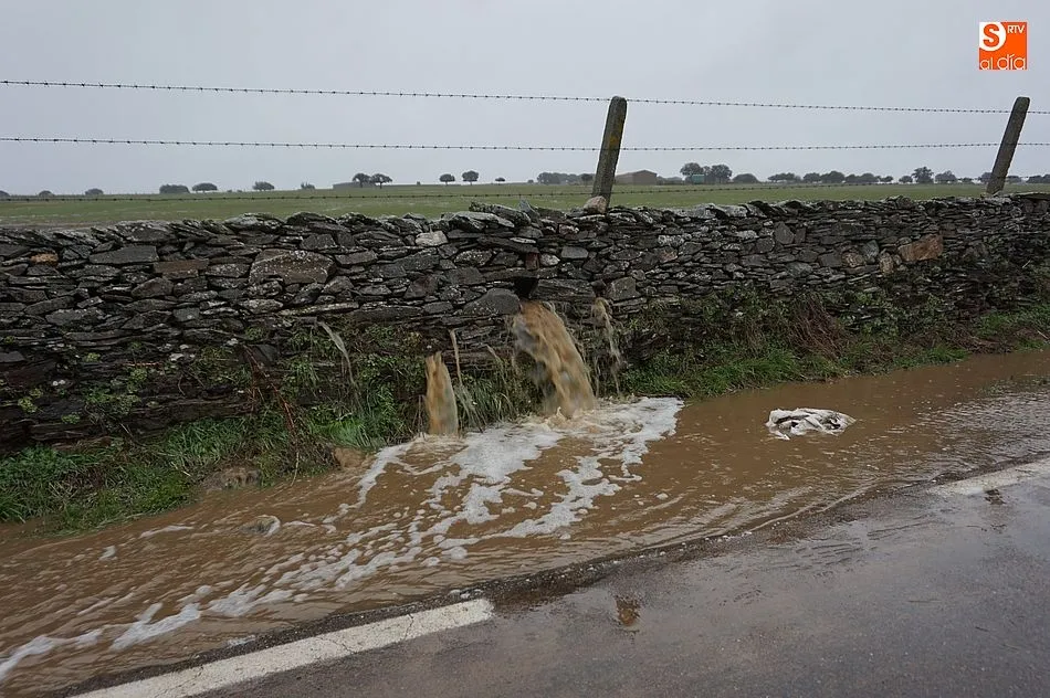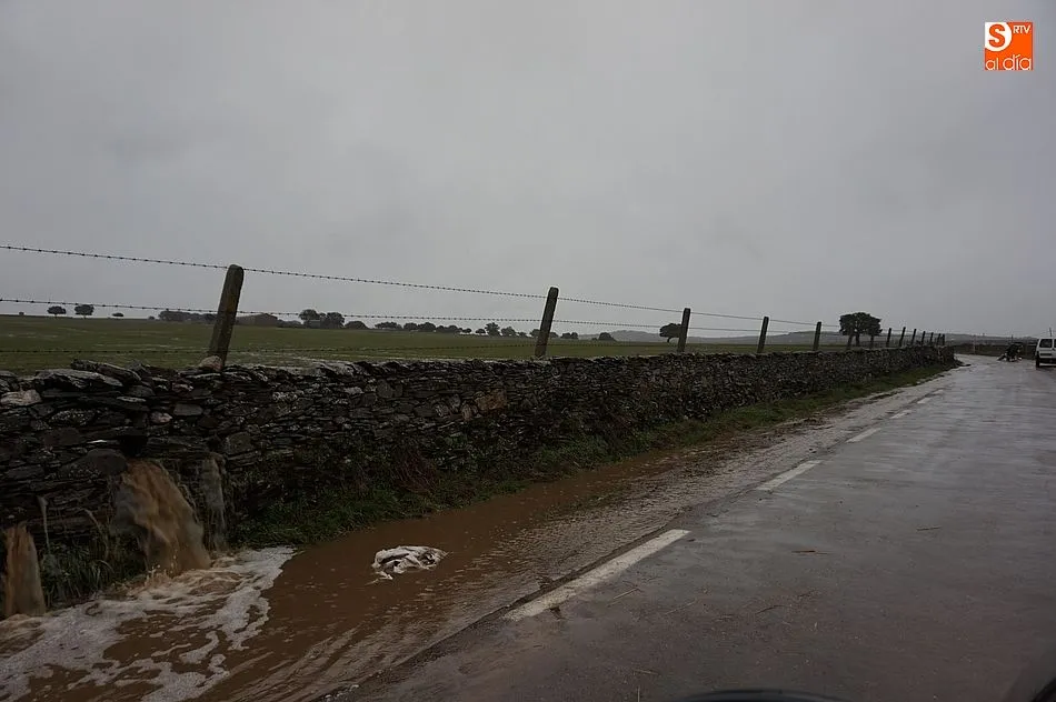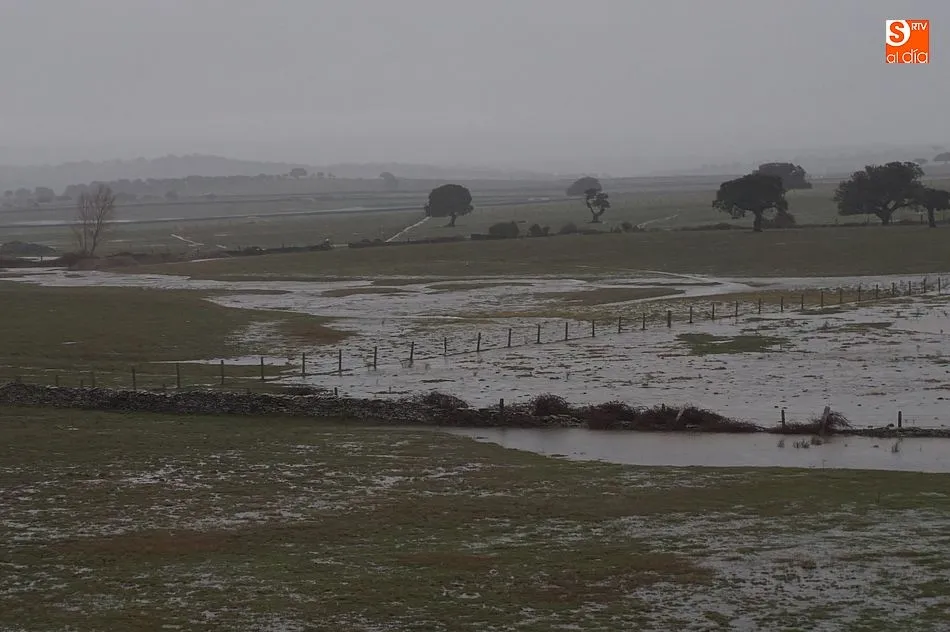 El fuerte temporal de lluvia y viento que ha traído la borrasca Gisele se ha dejado sentir con especial intensidad hoy en el sur de la provincia de Salamanca. Desde primera hora de la mañana la intensidad de la lluvia ha ido en aumento sin cesar un solo momento en toda la jornada. En la comarca de Guijuelo e inicio del Campo Charro, la mayor parte de los campos están anegados y el agua comienza a acumularse en desniveles y zonas más bajas, lo que está afectando a numerosos caminos agrícolas e incluso carreteras secundarias, como el ramal de acceso a Pizarral, que en algunos tramos el asfalto está debajo de varios centímetros de agua.