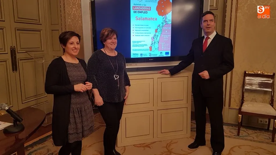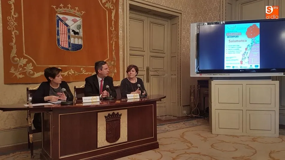 El concejal de Economía y Empleo, Enrique Sánchez-Guijo; la portavoz de la Fundación Santa María la Real, Soraya de las Sías; y la responsable de los programas de Empleabilidad de la Fundación Telefónica, Elena Ayuso, han presentado en el Ayuntamiento la tercera edición del programa ?Lanzaderas de Empleo? en Salamanca, que también cuenta con la colaboración de la Diputación y el Fondo Social Europeo.