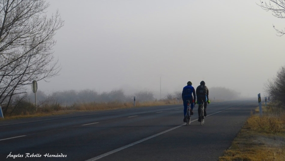 ¿Hacia dónde caminan esos dos ciclistas, que, de espaldas a nosotros, realizan un camino enigmático que la niebla vela, como cortina de fondo? Es todavía invierno? (José Luis Puerto) / Foto de Ángeles Rebollo