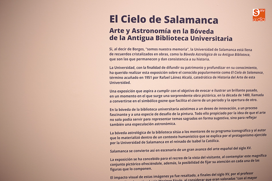 Difundir el valioso patrimonio de la Universidad es uno de los objetivos del VIII Centenario y también de esta exposición sobre unos de los principales iconos del Estudio salmantino, en el que confluyen arte y ciencia. ?El Cielo de Salamanca. Arte y astronomía en la bóveda de la antigua Biblioteca Universitaria? aspira a evocar e ilustrar un brillante pasado en un momento en el que surge una sorprendente obra pictórica, en la década de 1480. ?Celebrar es inseparable de reflexionar y tenemos una obra extraordinaria que da consistencia a nuestro pasado?, ha afirmado Martínez Frías, quien ha destacado que la exposición permite que el espectador ?pueda caminar por los senderos que propone ?El Cielo de Salamanca??.