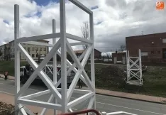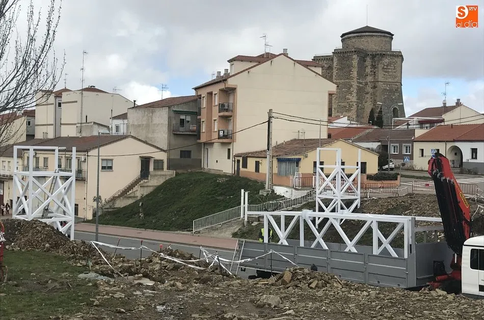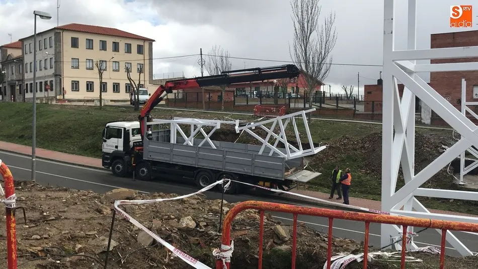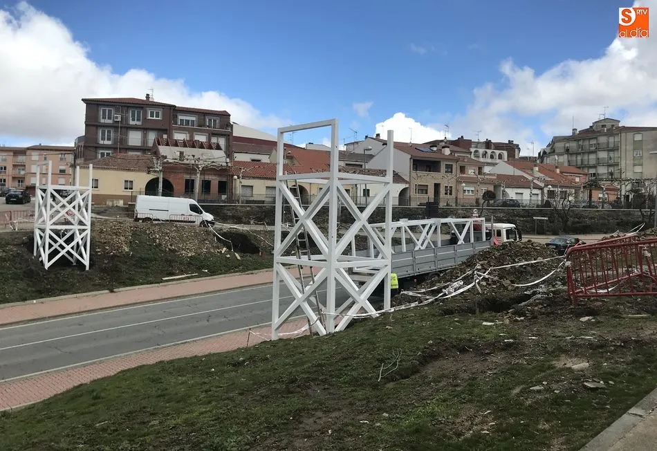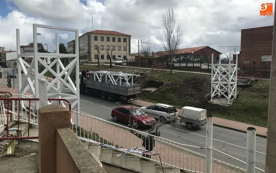 ALBA DE TORMES | La nueva pasarela de la calle Sol Alta avanza con la colocación casi integra de sus seis pilares, que destacan por sus grandes dimensiones