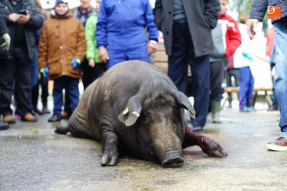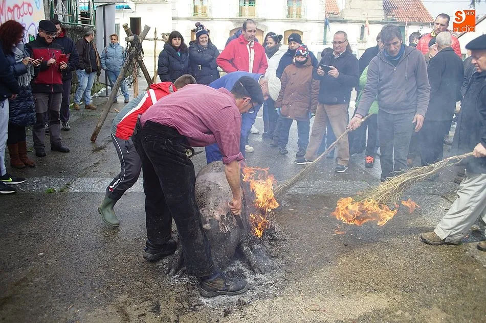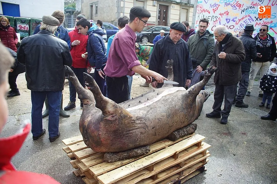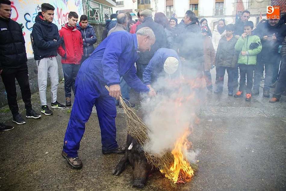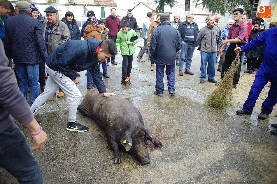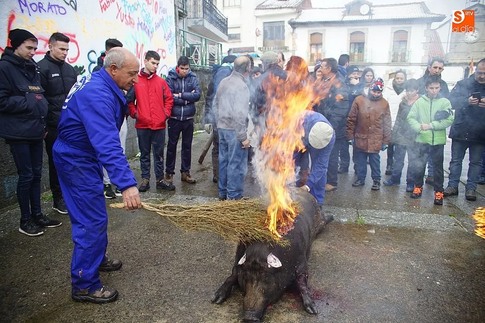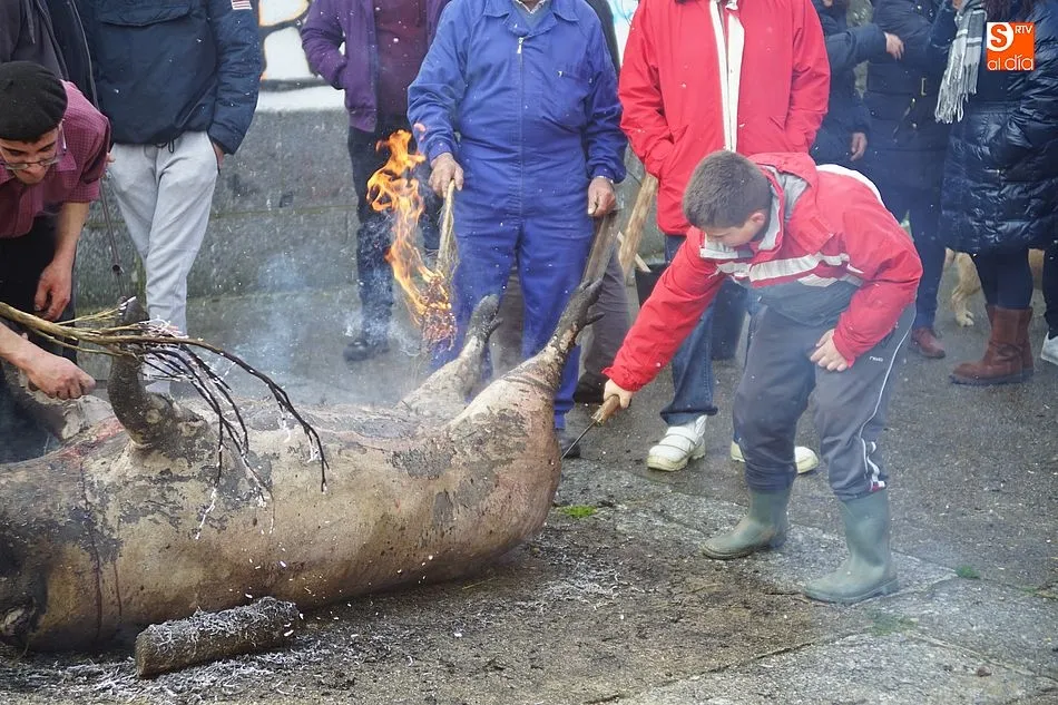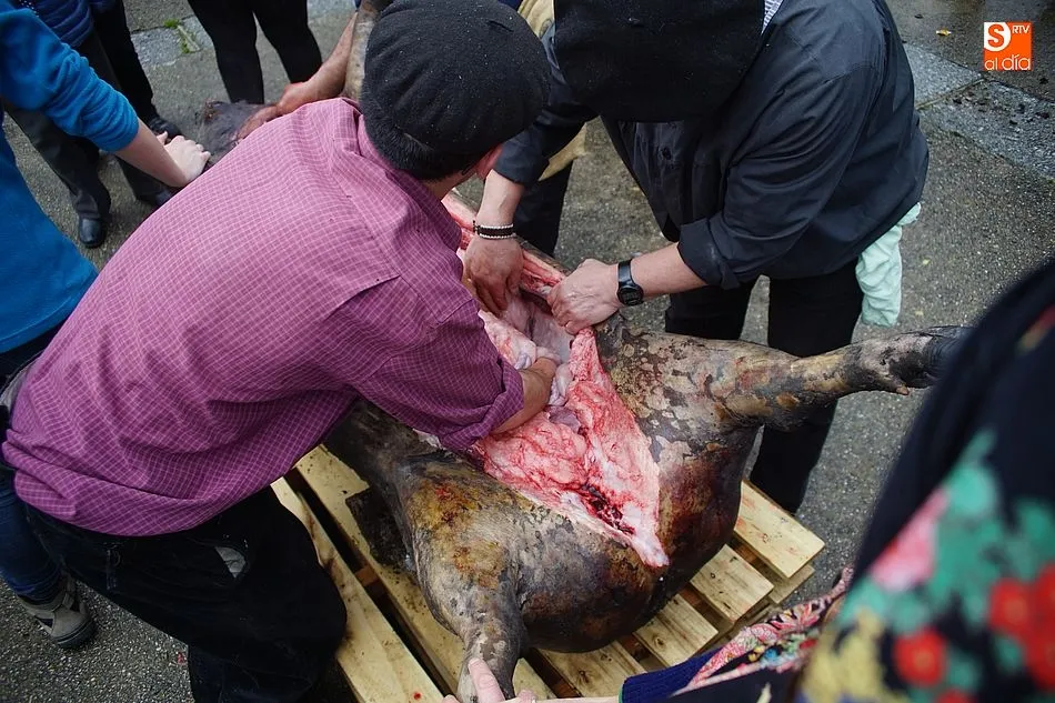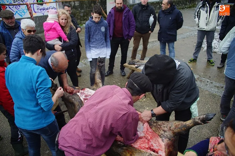 En torno a las 12:30 horas se procedió al despiece del animal que llegó a la plaza ya sacrificado, tal y como manda la legislación, y los matarifes locales y las voluntarias de la asociación Corral de Concejo se pusieron manos a la obra. Tras el chamuscado, y con la animación de Kamaru Teatro se avanzó en la fiesta, en la que no faltó la música de la gaita y el tamboril de Óscar Navarro, para que se animaran algunos de los presentes con bailes tradicionales como el de la botella. Medio centenar de vecinos se acercó al ágora, entre los que estaban el alcalde, Juan Morato, y diputado provincial de Turismo, Javier García.