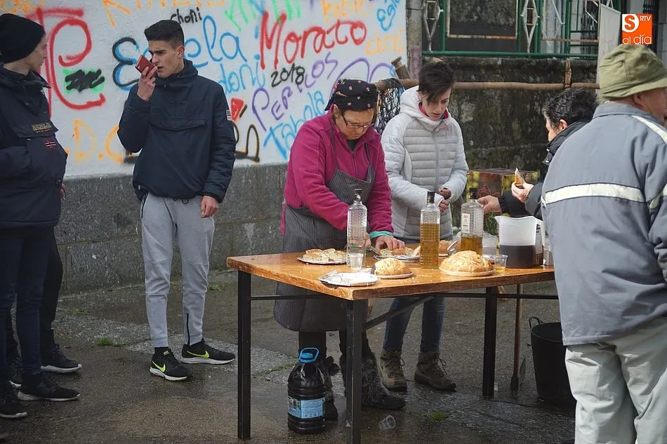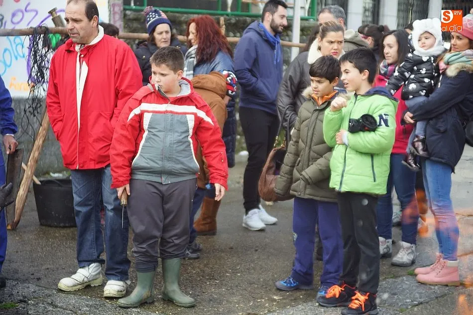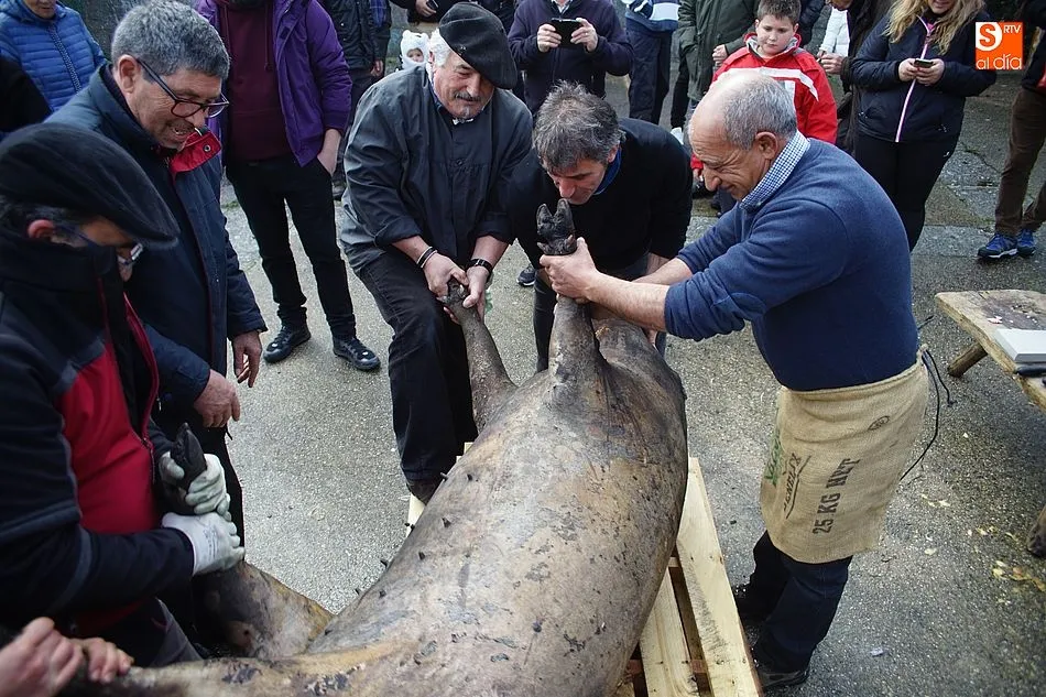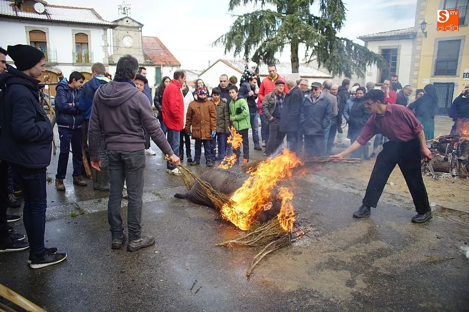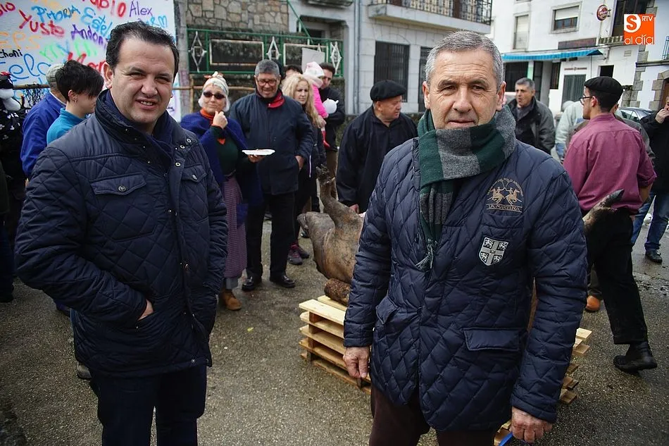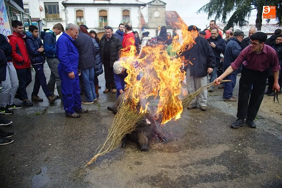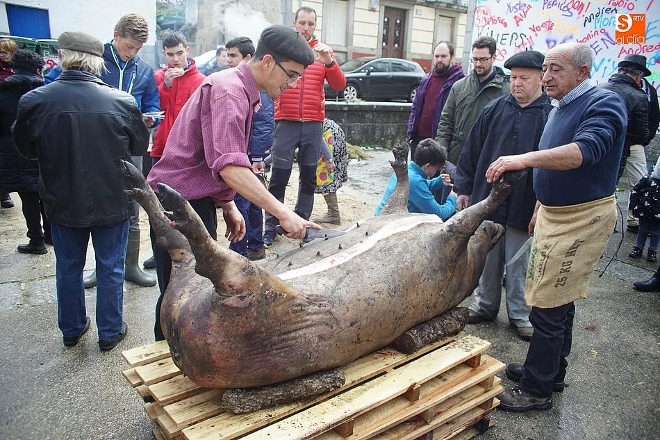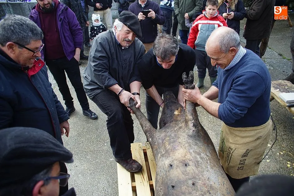 En torno a las 12:30 horas se procedió al despiece del animal que llegó a la plaza ya sacrificado, tal y como manda la legislación, y los matarifes locales y las voluntarias de la asociación Corral de Concejo se pusieron manos a la obra. Tras el chamuscado, y con la animación de Kamaru Teatro se avanzó en la fiesta, en la que no faltó la música de la gaita y el tamboril de Óscar Navarro, para que se animaran algunos de los presentes con bailes tradicionales como el de la botella. Medio centenar de vecinos se acercó al ágora, entre los que estaban el alcalde, Juan Morato, y diputado provincial de Turismo, Javier García.