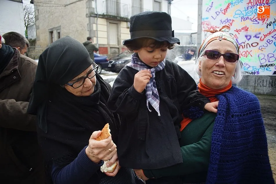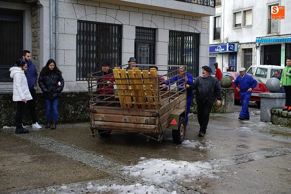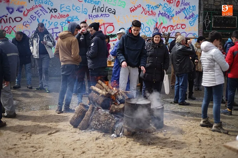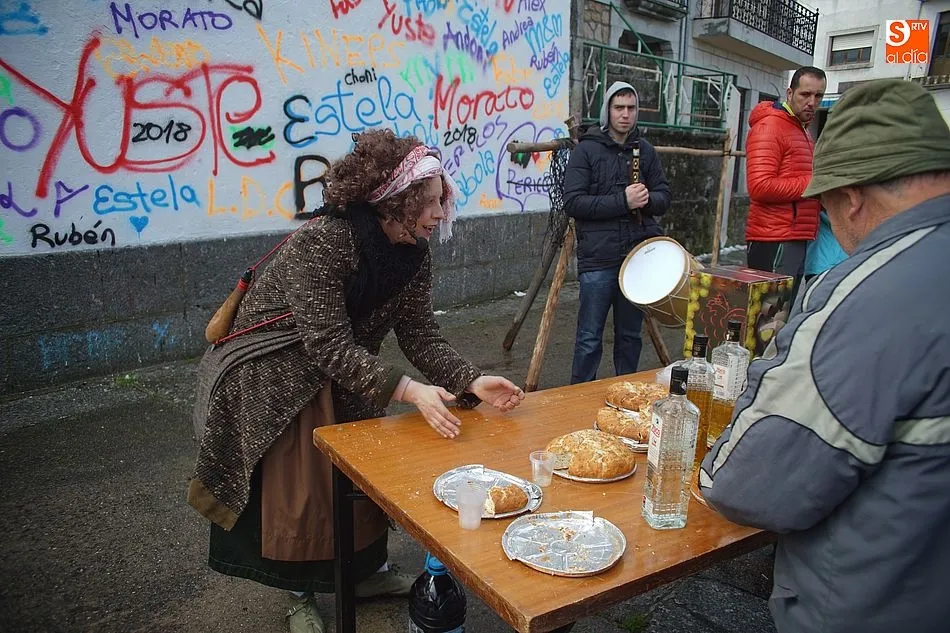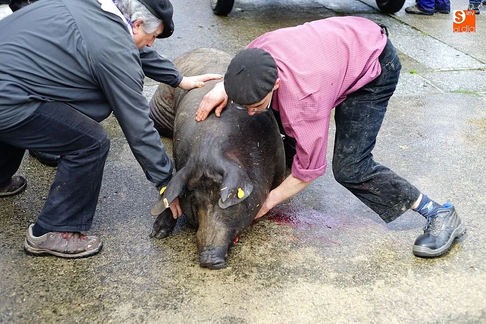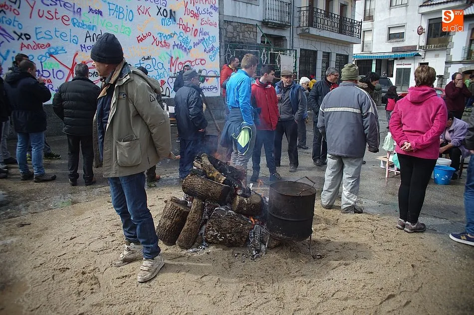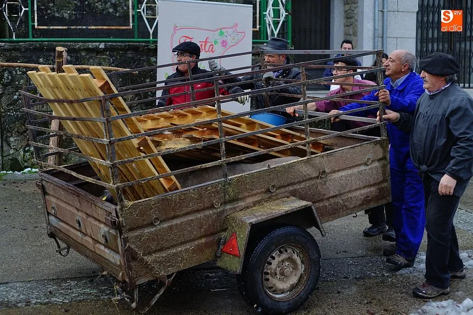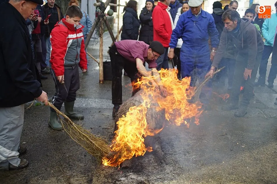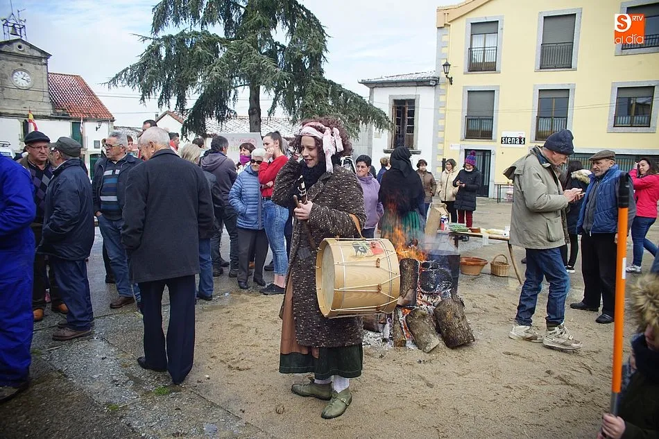 En torno a las 12:30 horas se procedió al despiece del animal que llegó a la plaza ya sacrificado, tal y como manda la legislación, y los matarifes locales y las voluntarias de la asociación Corral de Concejo se pusieron manos a la obra. Tras el chamuscado, y con la animación de Kamaru Teatro se avanzó en la fiesta, en la que no faltó la música de la gaita y el tamboril de Óscar Navarro, para que se animaran algunos de los presentes con bailes tradicionales como el de la botella. Medio centenar de vecinos se acercó al ágora, entre los que estaban el alcalde, Juan Morato, y diputado provincial de Turismo, Javier García.