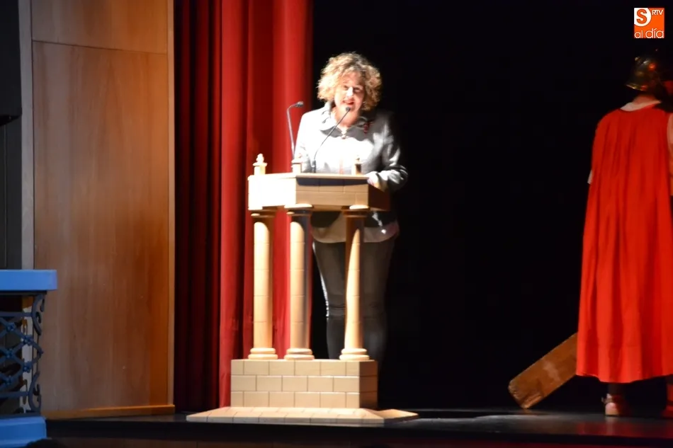 La presidenta de la Cofradía del Nazareno, Marian Cruz, también intervino en los momentos iniciales del acto en el Teatro, que tuvo cierto espíritu de las escenificaciones de La Pasión, aunque de una forma diferente, contando con la colaboración de las 7 Cofradías de la Semana Santa, que estuvieron representadas en el escenario y sus aledaños a través de una serie de ?cuadros? que conformaban un museo.