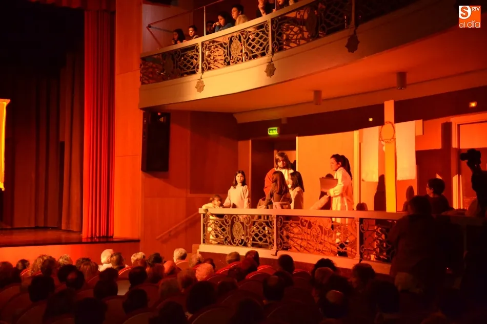 La parte teatral del pregón concluyó con los personajes hablando de los jóvenes, concretamente de lo lejos que pueden estar del patrimonio, acabando por hacer una mención al Juan de Juni. La parte final del acto fue diferente al resto. Para empezar, entraron en el patio de butacas representantes de las cofradías de la Semana Santa Mirobrigense, ataviados con la indumentaria habitual con la que procesionan.
