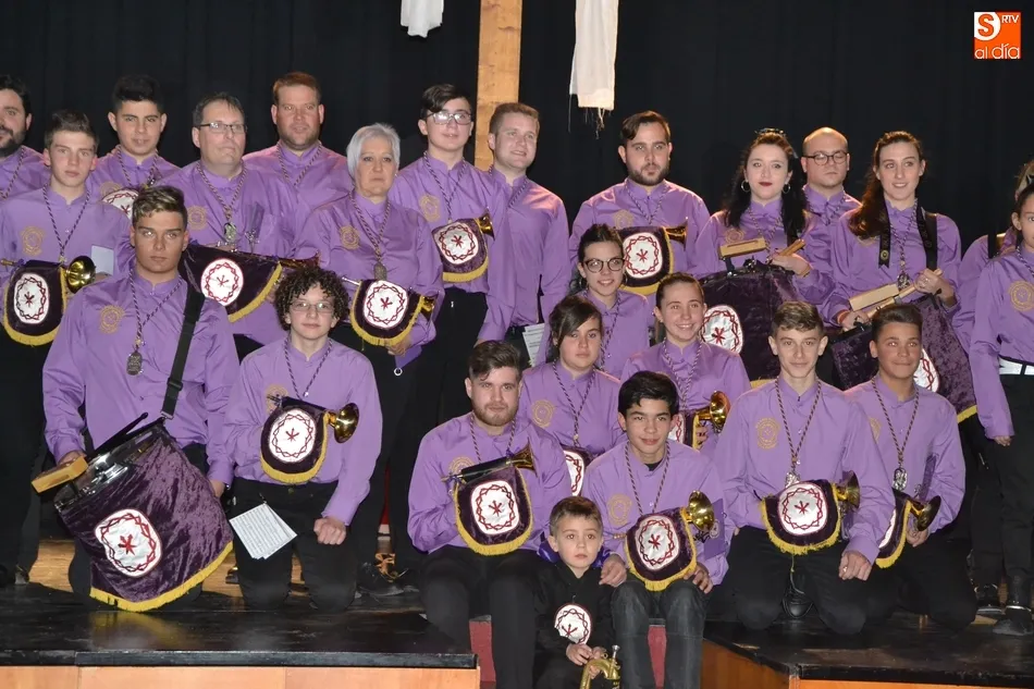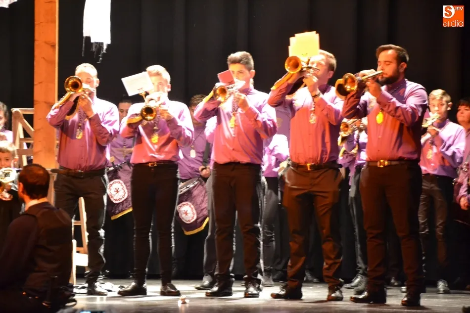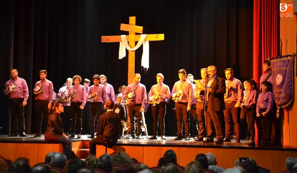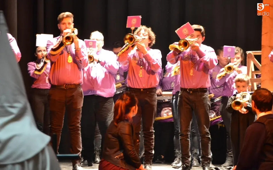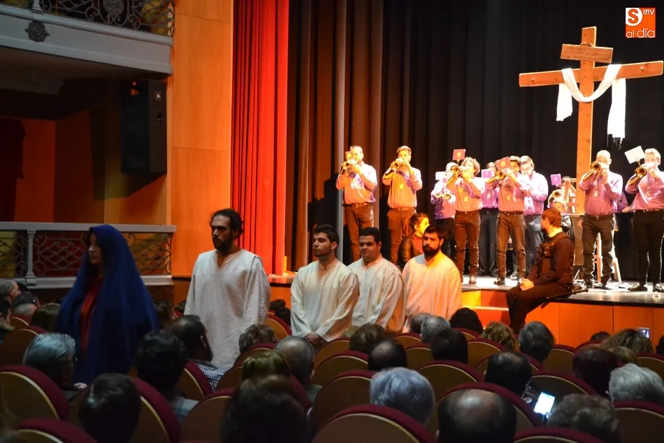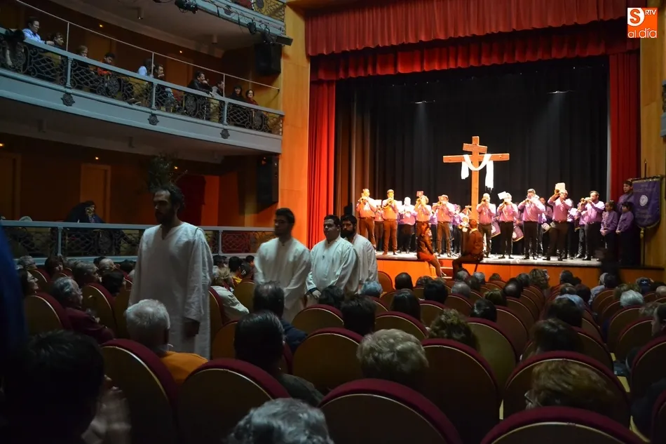 Una vez colocados en el patio de butacas, hizo entrada en el escenario la Banda de Cornetas y Tambores de la Cofradía de Jesús Nazareno, que interpretó una pieza, antes de que tomase la palabra brevemente uno de los creadores del texto de la velada, Juan Carlos Sánchez, quién animó a todos los cofrades a tomar sus posiciones, hacer silencio ?y con devoción sincera?, caminar para ?encontrarse con El Señor en la Vía Dolorosa?.