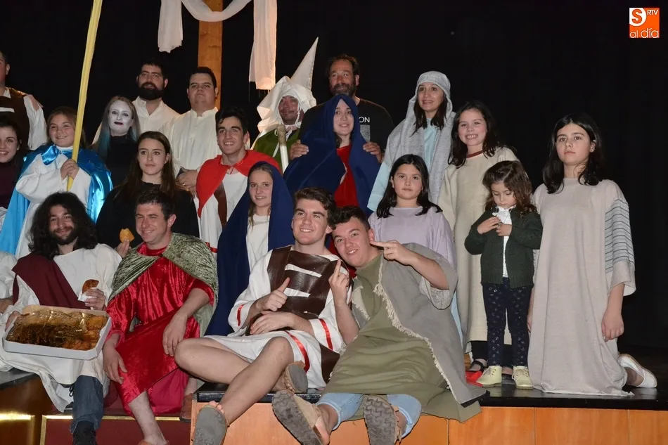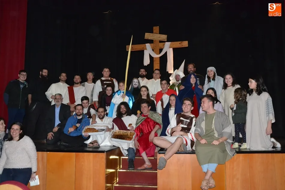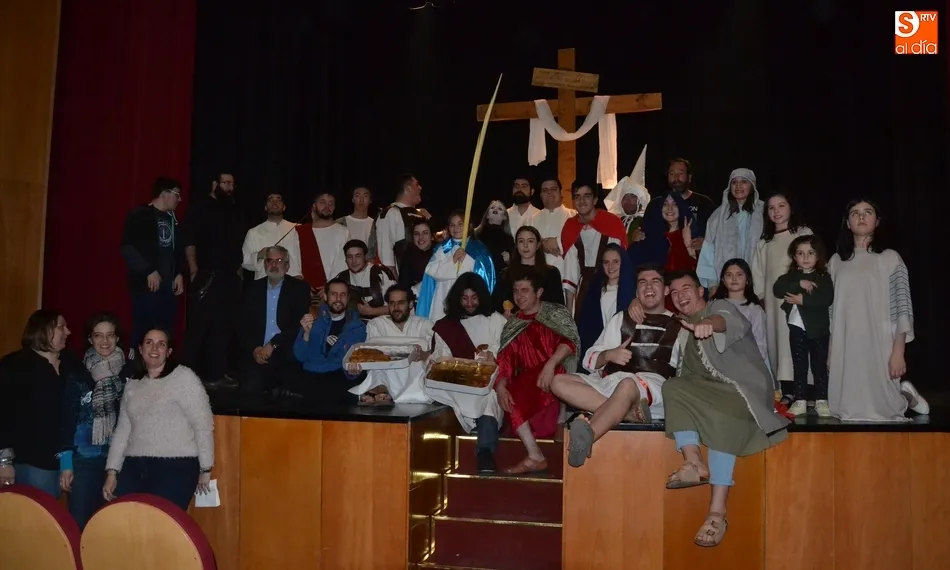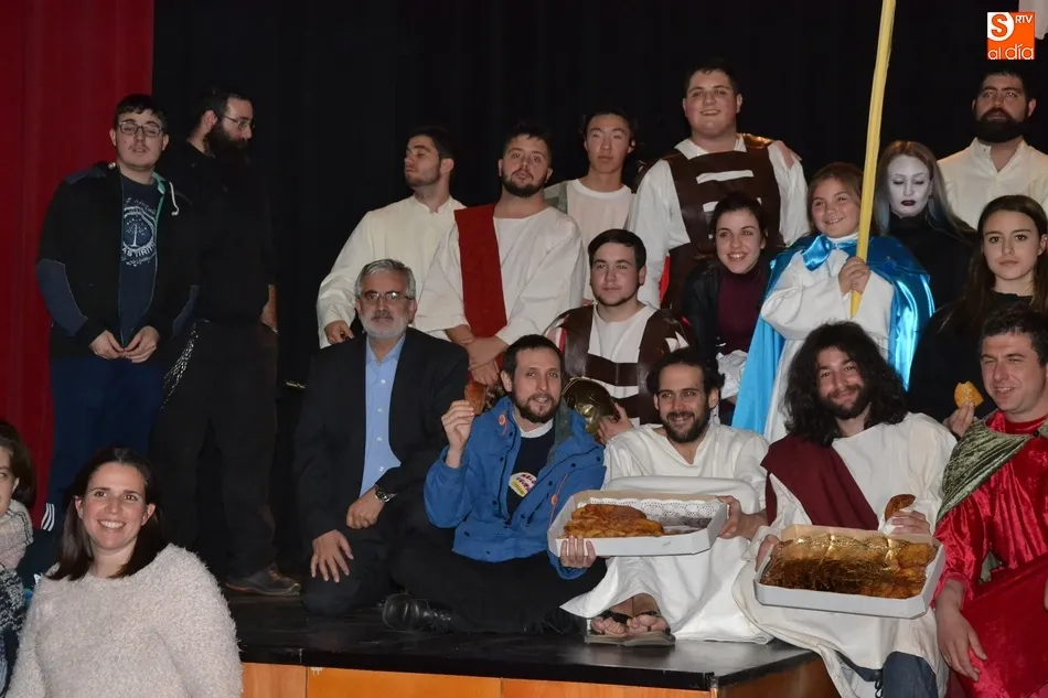 Además, pidió que se tenga para los costaleros y demás responsables de cada paso unas torrijas para degustar al final de las procesiones. Tras esas palabras, y mientras la Banda de Cornetas y Tambores tocaba otra pieza, todos los actores fueron saliendo por el patio de butacas hacia el hall del Teatro, donde se repartieron torrijas de forma gratuita a todos los asistentes. Asimismo, allí se entregaron los libros de la Semana Santa, y se pusieron a la venta las entradas para las representaciones de La Pasión del próximo sábado 24.