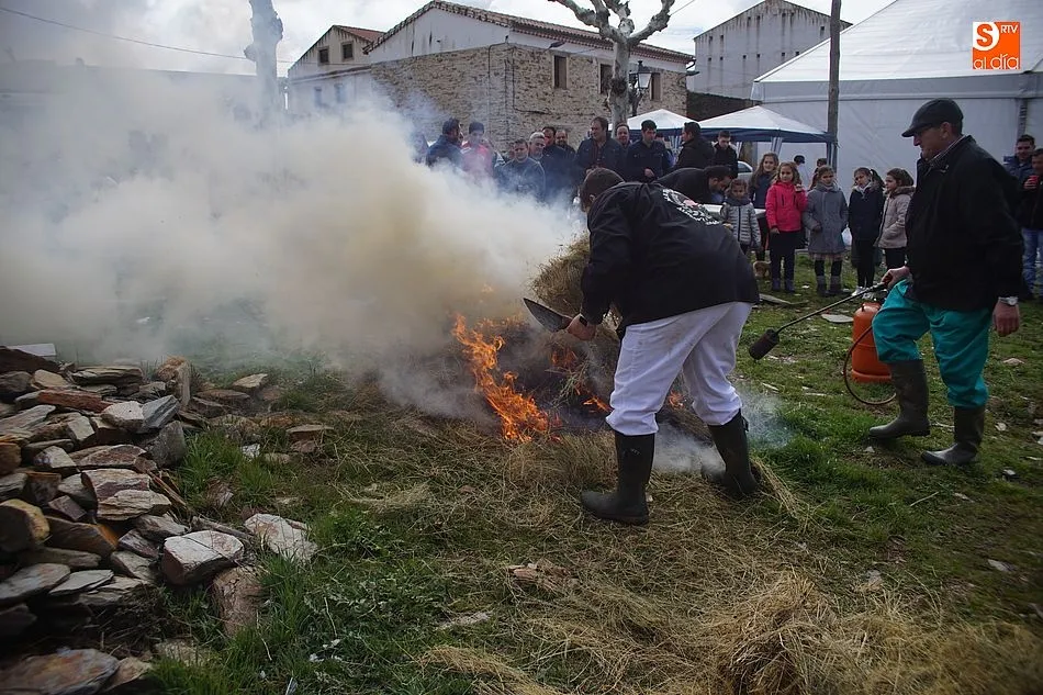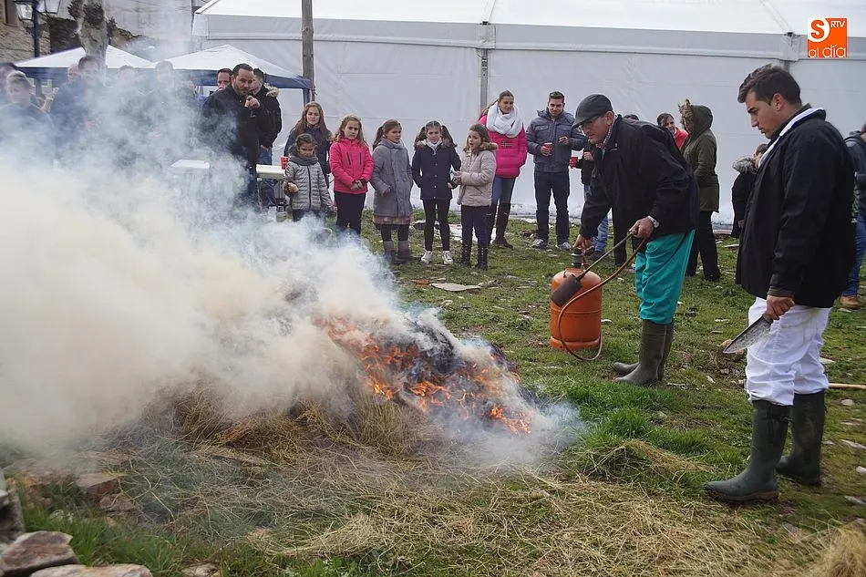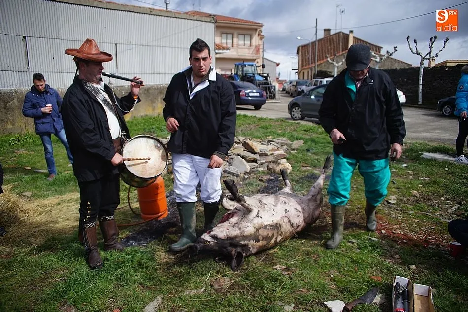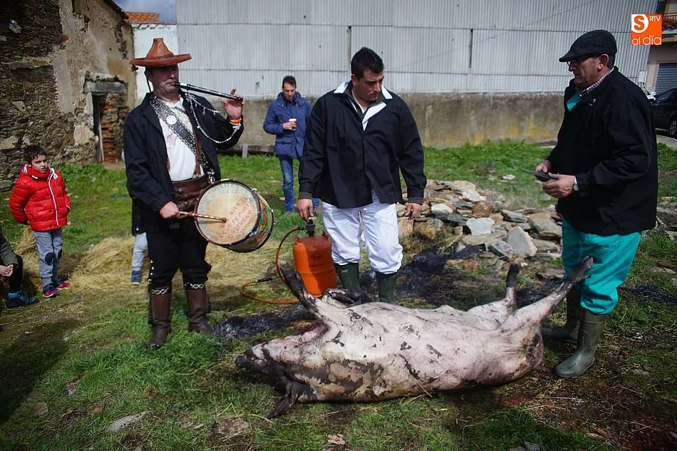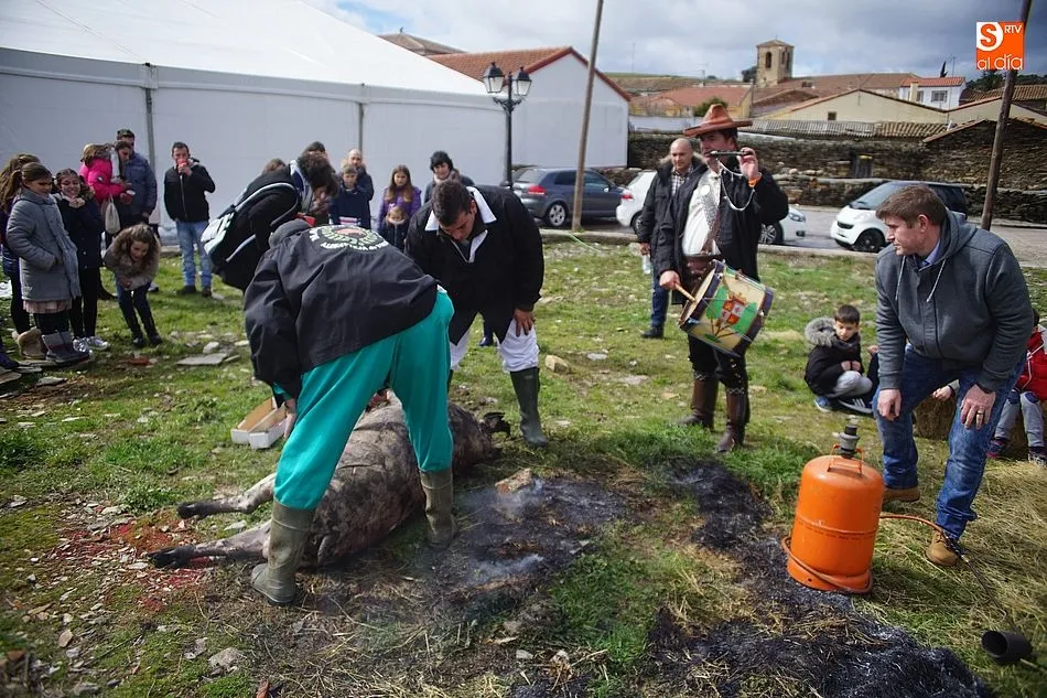 La jornada comenzó con los preparativos, con degustación de aguardiente y perrunillas al son de la gaita y el tamboril de Ángel Rufino de Haro, El Mariquelo, que acompañó el festejo toda la jornada. Los matarifes se ocuparon del chamuscado del animal, y el posterior despiece en torno a las 14:00 horas, con cielos despejados y un atento público que no quiso perderse los detalles del proceso.