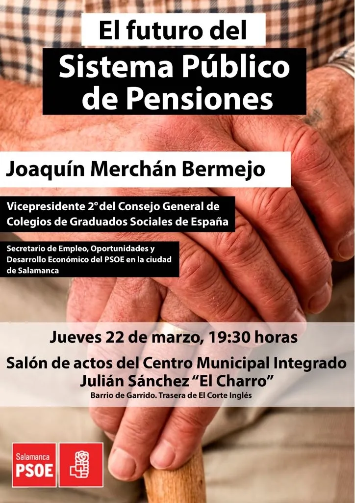 El salón de actos del Centro Municipal Integrado Julián Sánchez ?El Charro? acogerá el próximo jueves, 22 de marzo, una charla sobre ?El futuro del sistema público de pensiones? a cargo de Joaquín Merchán Bermejo, vicepresidente 2º del Consejo General de Colegios Oficiales de Graduados Sociales de España y experto en la materia. La charla, organizada por el PSOE de Salamanca, tendrá lugar a las 19.30 horas.