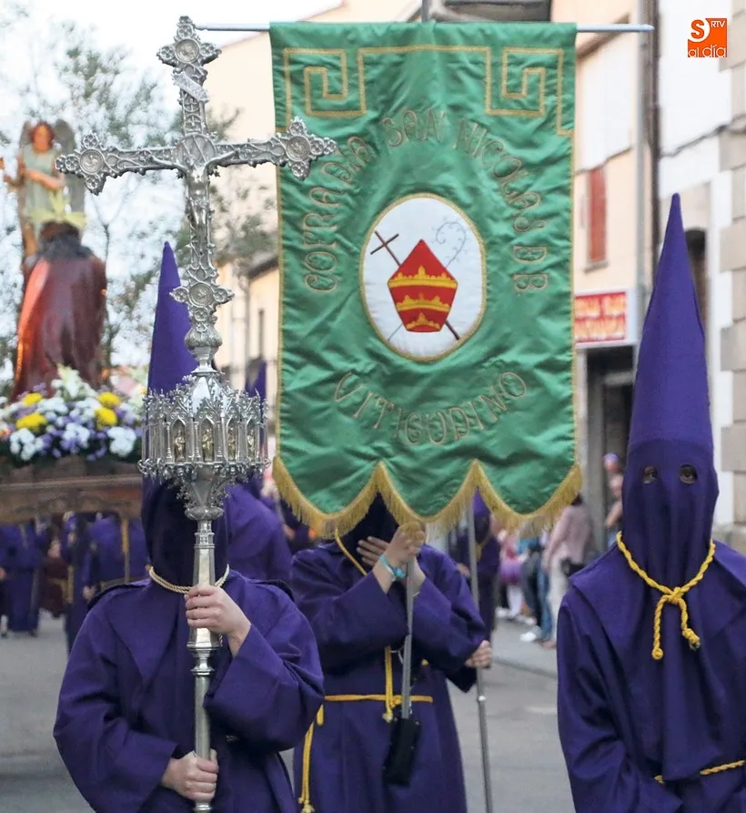 El Domingo de Pascua proporciona marco a la procesión del Encuentro entre la Madre y el Hijo; la primera es despojada del negro manto de dolor para proclamar la alegría de la Resurrección por medio del blanco. Ledesma representa, delante de Santa María la Mayor, ese encuentro literalmente a la carrera. Peñaranda de Bracamonte, en cambio, ofrece la singularidad de un personaje, el Arcángel San Miguel (representado por un niño con sus alas), que proclama la Resurrección de Cristo y da pie para quitarle el luto a la Virgen María, y que recuerda el personaje protagonista de otro rito popular, en idéntica fecha, conocido como la Bajada del Ángel, en Aranda de Duero o Peñafiel, entre otros lugares de la región. En La Vellés, la singularidad la ofrecen los niños que llevan roscas de pan en la procesión. En Sotoserrano, los muchachos descuelgan y queman el Judas, después de voltearlo hasta desentrañarle la paja en el aire de la Plaza Mayor. A trazo grueso, este es el guión de la Semana Santa, que año tras año revive, actualizándose, en nuestros pueblos.
