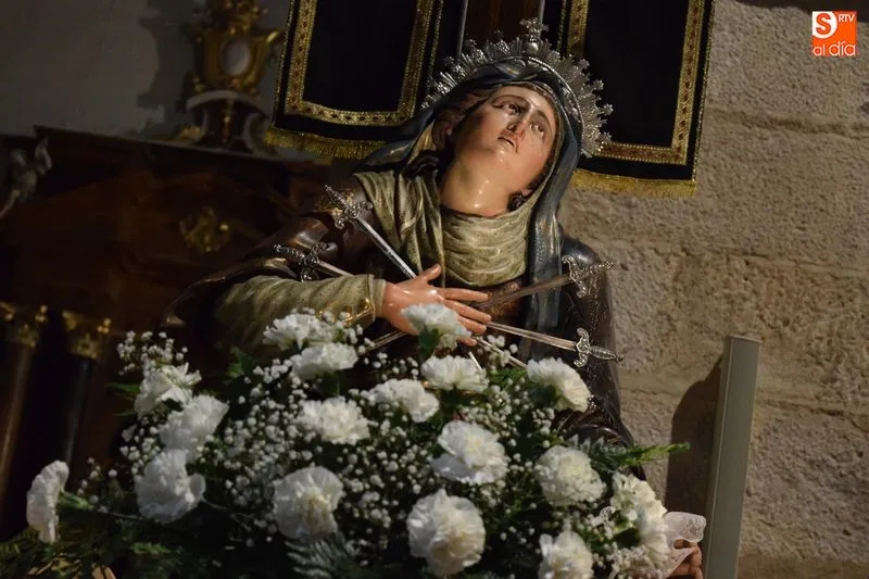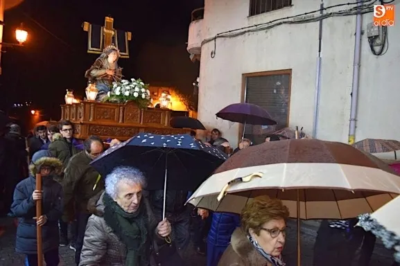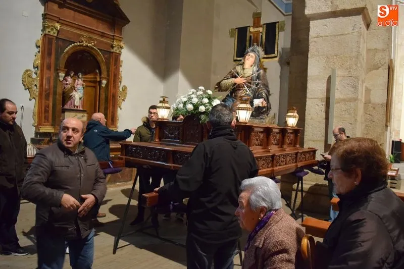 Alba de Tormes inició su Semana Santa esta noche con la salida en procesión del Vía Crucis. La lluvia no impidió la marcha de la Virgen de los Dolores por las calles de la villa ducal, aunque si condicionó el recorrido, teniéndose que suprimir las estaciones por el mal tiempo para evitar daños en el paso.