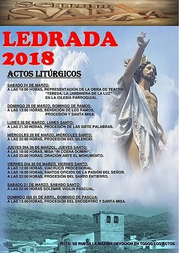 La programación de Semana Santa en Ledrada está a punto de comenzar con las habituales propuestas litúrgicas por parte de la parroquia y la Cofradía de Jesús El Nazareno. En esta ocasión, la novedad estriba en la inclusión de la obra de teatro ?Teresa, la jardinera de la luz? mañana, sábado 24, cita que dará inicio a las actividades.