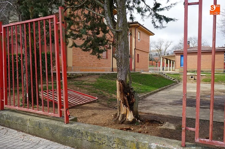 La Policía Local de Guijuelo alertó esta mañana del derribo de parte de un árbol del patio delantero del colegio Miguel de Cervantes. En su caída, la mitad del árbol dañó la valla delantera y obstaculizó el aparcamiento del centro educativo. Al lugar acuderion los bomberos de la villa para trocear y retirar los restos.