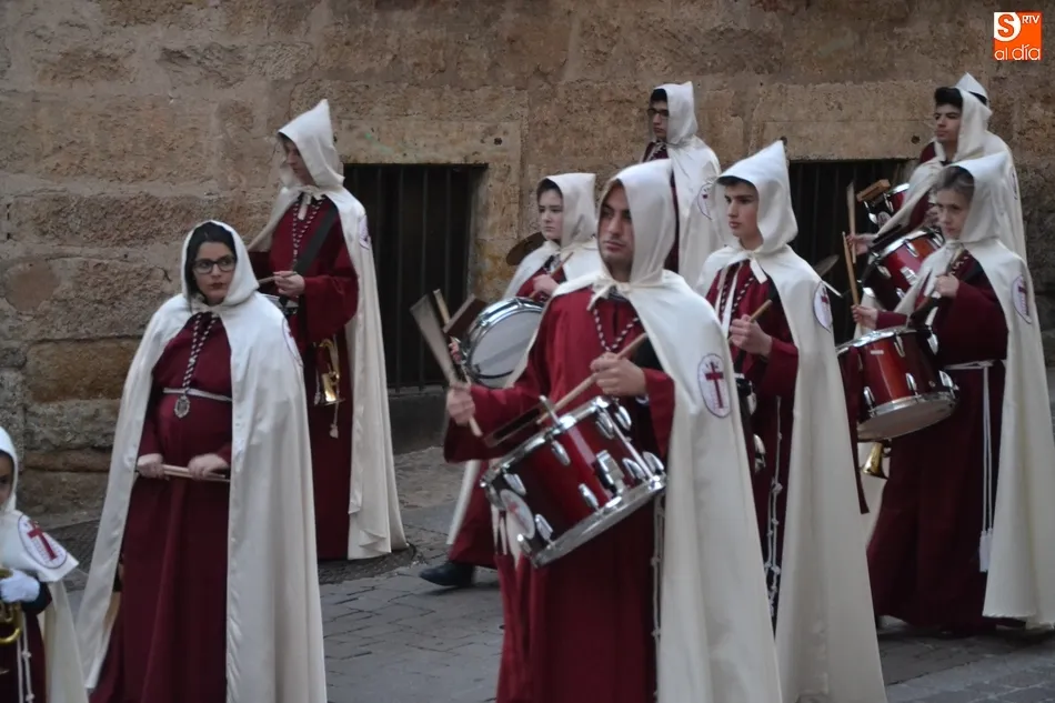La comitiva procesional fue abierta por la Banda de la Cofradía de la Santa Cruz, que hacía su debut en esta Semana Santa, más tardío que en años anteriores al no tomar parte en la procesión de La Borriquilla. Tras algunas banderas, marchaba el histórico paso de Jesús en el Huerto de los Olivos, que iba en carroza.