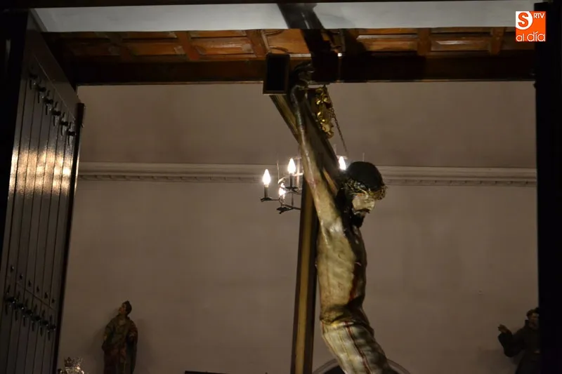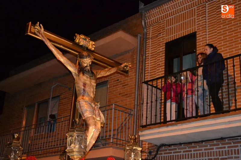 Y nuevamente, quizás cada vez más multitudinario, el momento de mayor emoción se producía a las puertas de su nuevo emplazamiento temporal como es la Ermita de San Luis. Tras una sentida oración pronunciada por el párroco de la ciudad Fernando García, los costaleros del Santo Cristo introducían la imagen en el templo de rodillas, instantes de gran esfuerzo, lo que generaban una gran ovación de la multitud de fieles que abarrotaron los alrededores de la Ermita, y a la que siguieron vítores y palmas hacia ambas tallas.