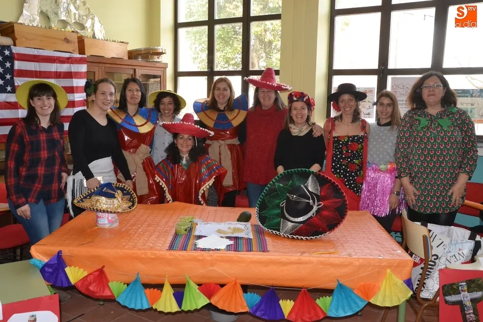 Estos stands de comida estuvieron repartidos por distintas dependencias del Colegio, moviéndose los niños junto a sus profesores de uno a otro. Los stands fueron atendidos por madres de alumnos, que intentaron caracterizarse al estilo del país de los platos que despachaban. Aprovechando su presencia, se hicieron una foto en el patio del Colegio junto al mural conmemorativo de la Semana Cultural que se ha creado en la pared del Pabellón de Conde de Foxá.