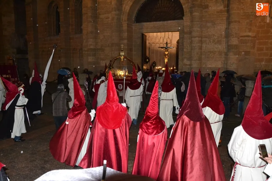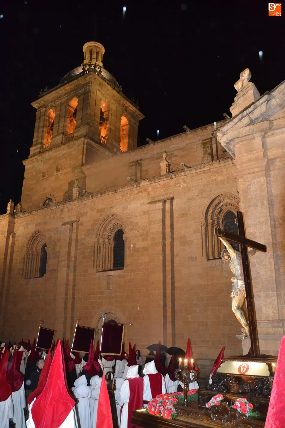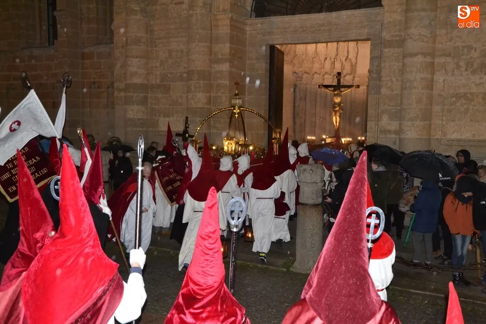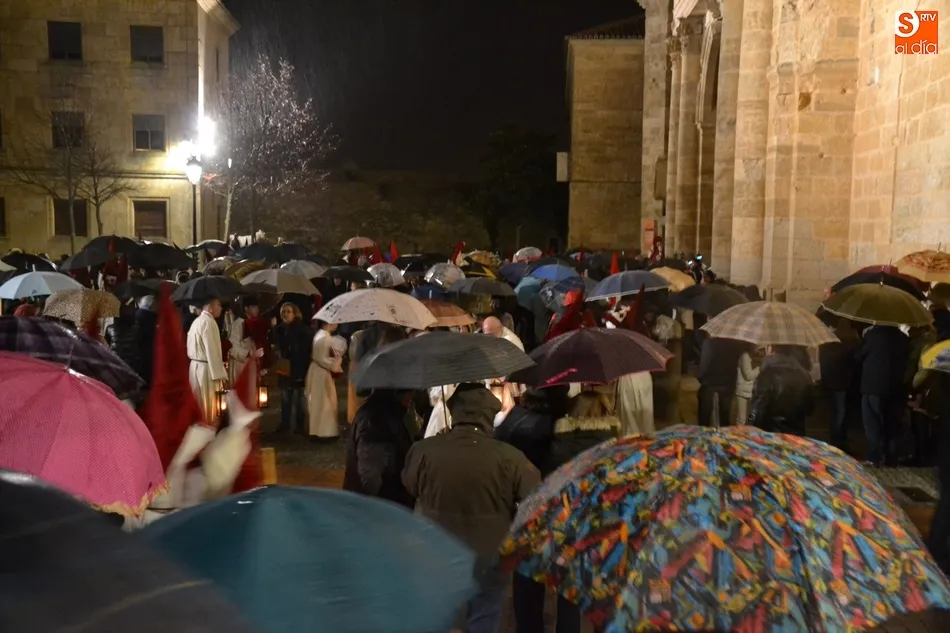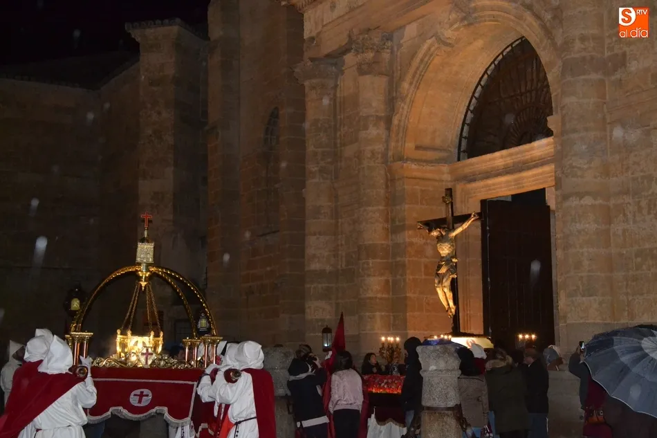 Los cientos y cientos de devotos que tiene en Ciudad Rodrigo el Santísimo Cristo de la Expiración no se quedaron sin verle en la noche del Jueves Santo aunque, lamentablemente, su desfile procesional por las calles mirobrigenes estuvo marcado por las inclemencias meteorológicas, que hicieron que desde el principio se acortase el recorrido, que acabó por recibir también la visita de la lluvia en las inmediaciones de la Catedral.