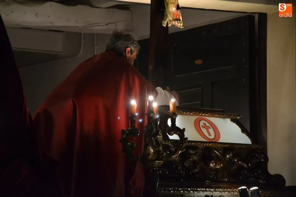 Pese a que la noche estaba muy desapacible, ya no sólo por el riesgo de lluvia, sino por el frío que hacía (producto principalmente del viento), cientos y cientos de personas se congregaron en la Plazuela Cristóbal de Castillejo para presenciar cómo la Hermandad sacaba al Cristo del Silencio de la Iglesia de San Pedro-San Isidoro para colocarlo en la habitual carroza para procesionar por las calles mirobrigenses.