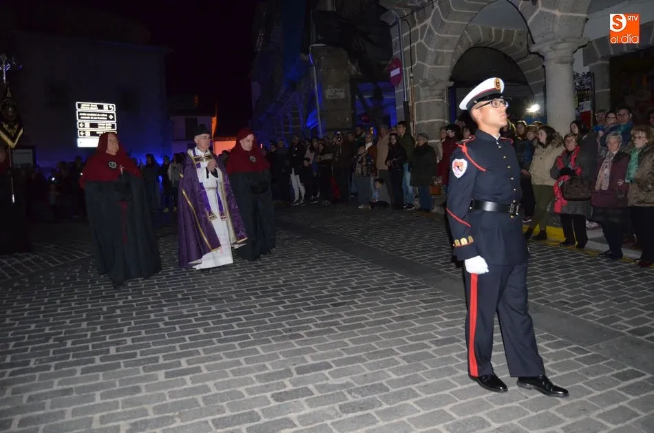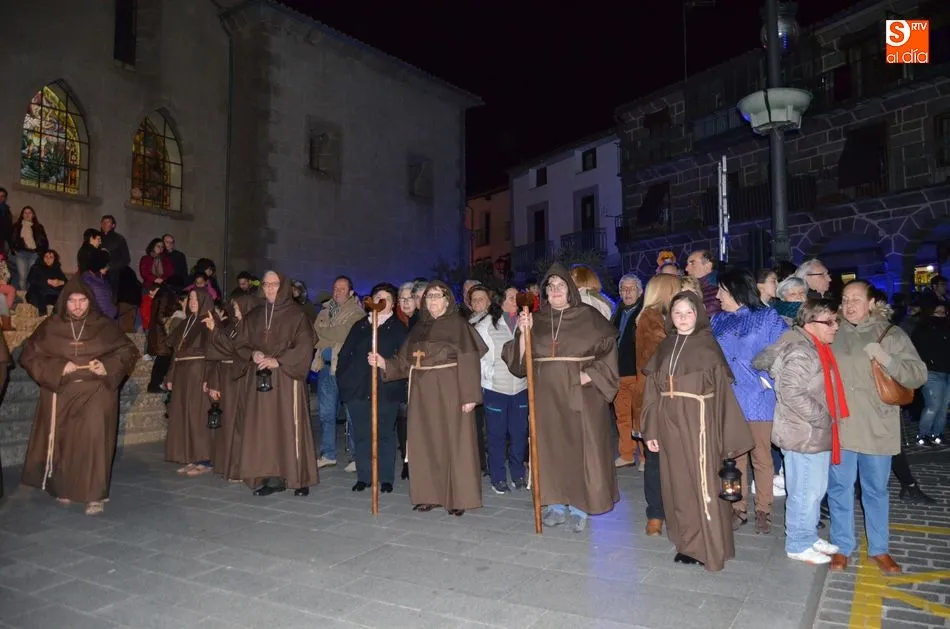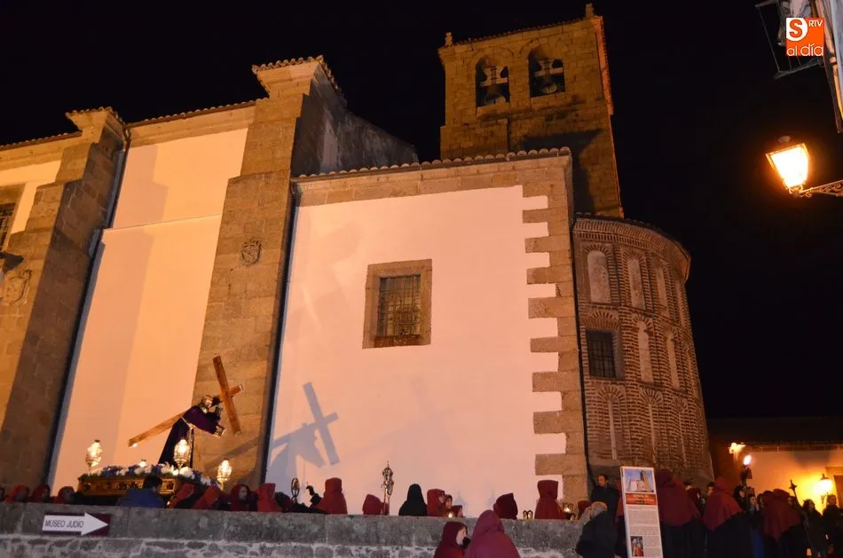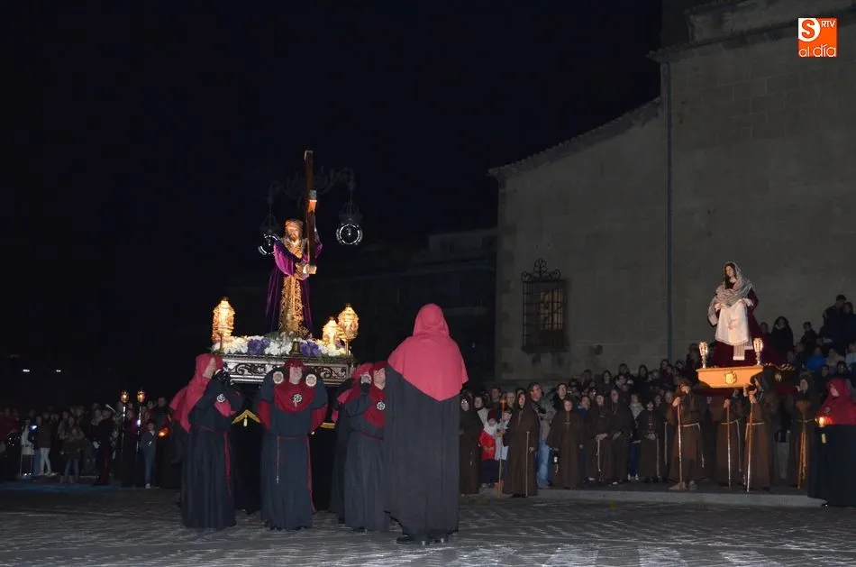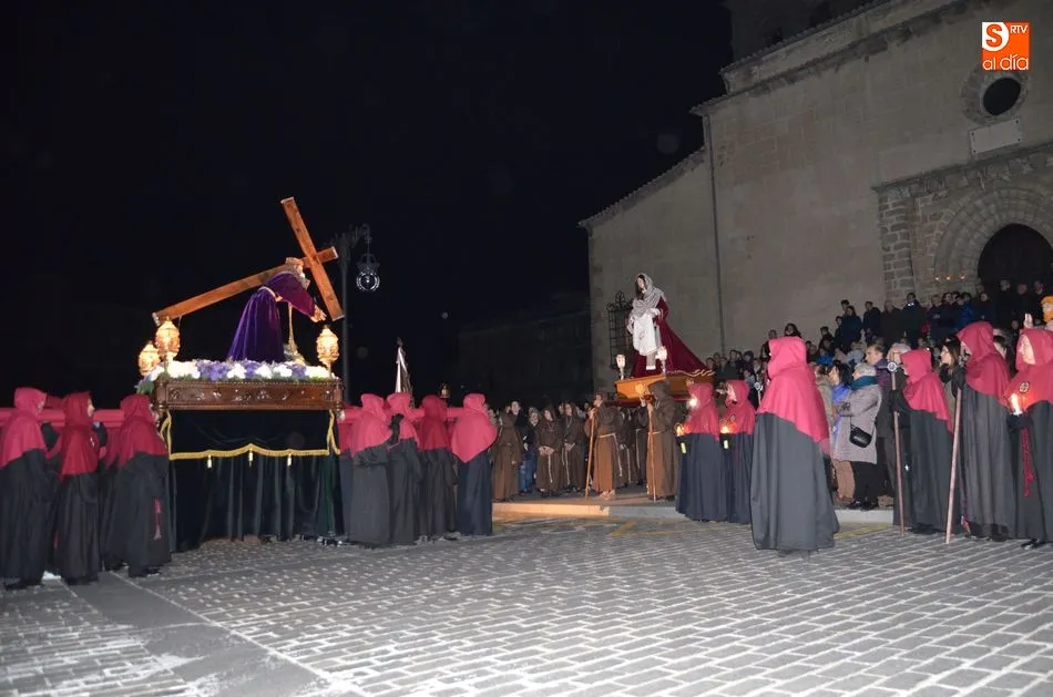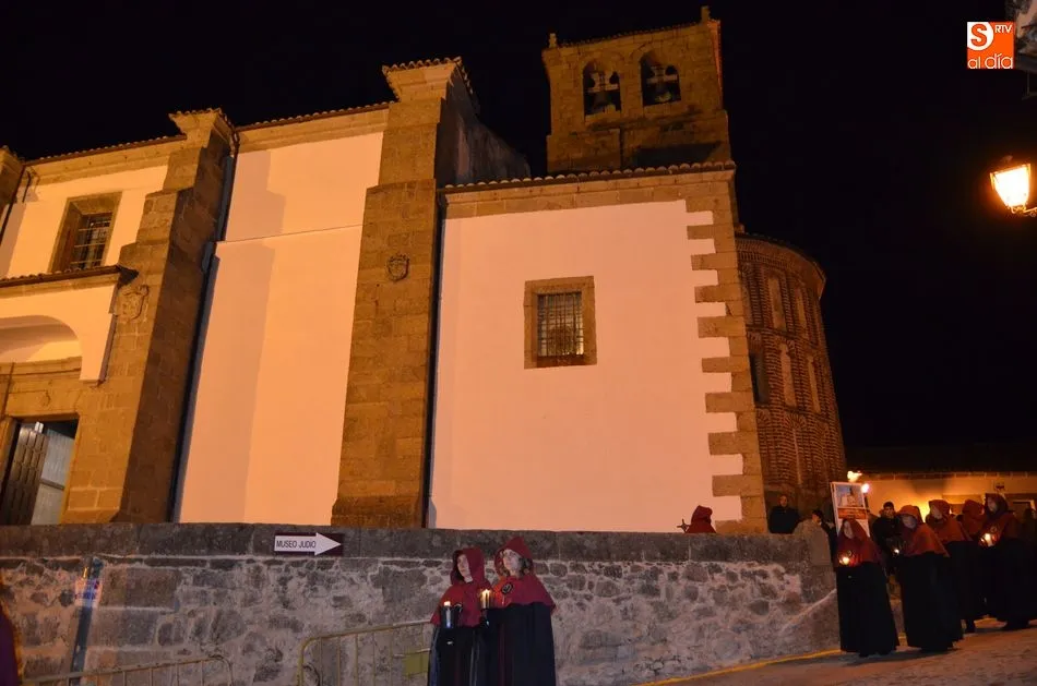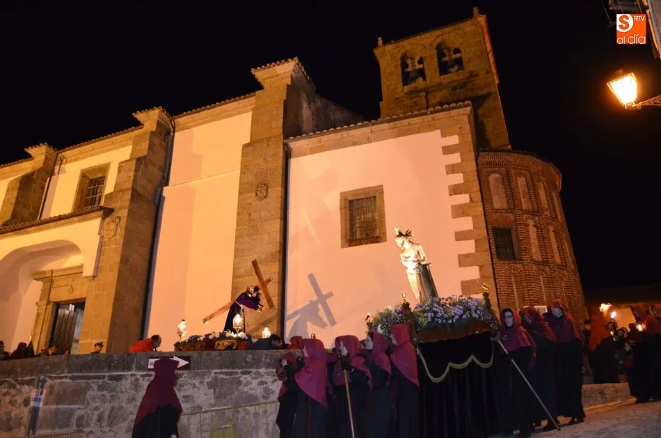 Emoción contenida en el recorrido de las dos imágenes que sobrecogen en la completa oscuridad de la Plaza Mayor a su encuentro con La Verónica de la Seráfica Hermandad, y la devoción se respira paso a paso en la Semana Santa bejarana.