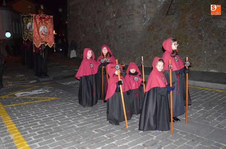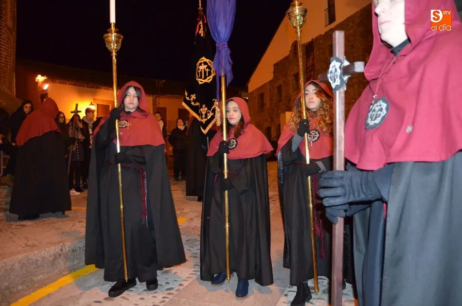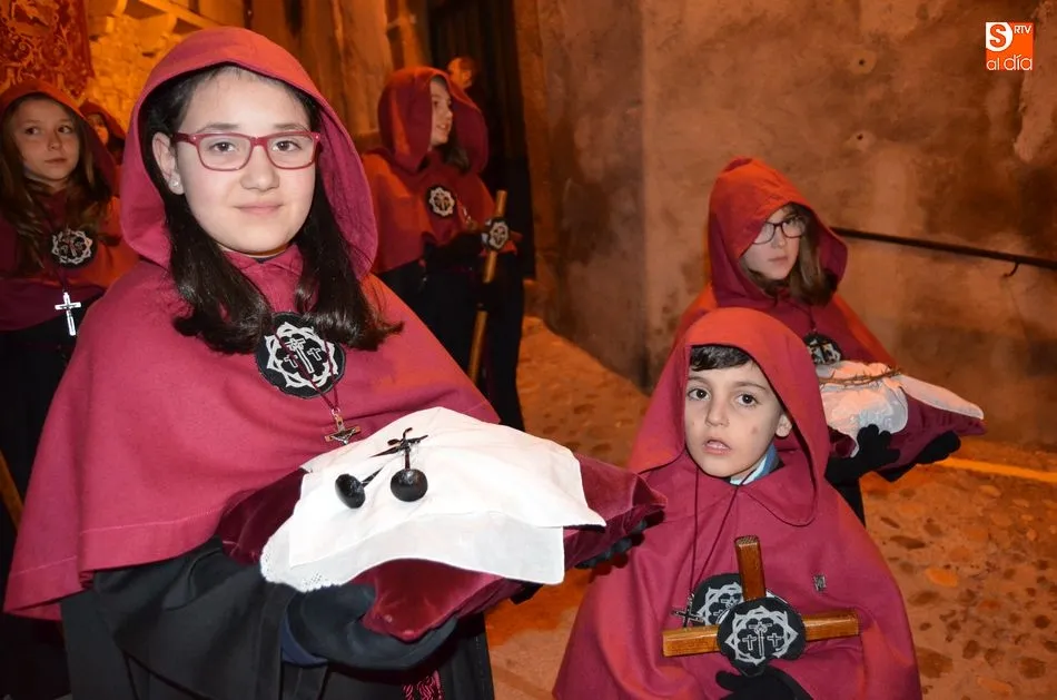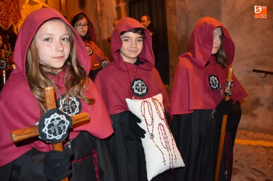 Al finalizar la Eucarística con imposición de hábitos y juramento, la procesión del Silencio rompe la noche con el Nazareno de hábito morado y oro, bordado por las monjas del convento de la Piedad.