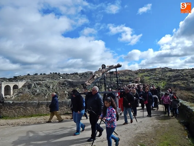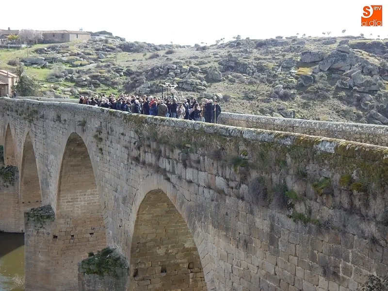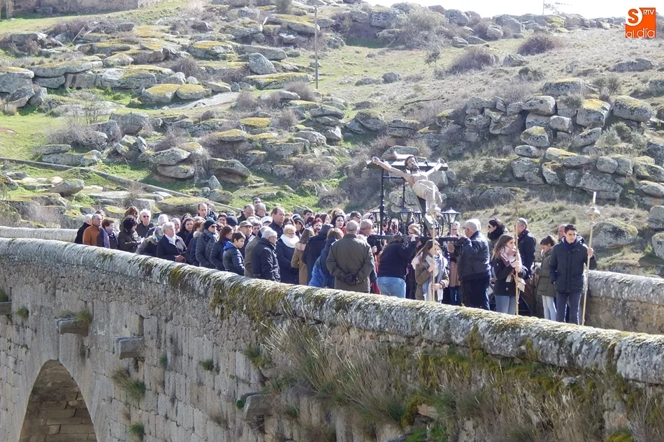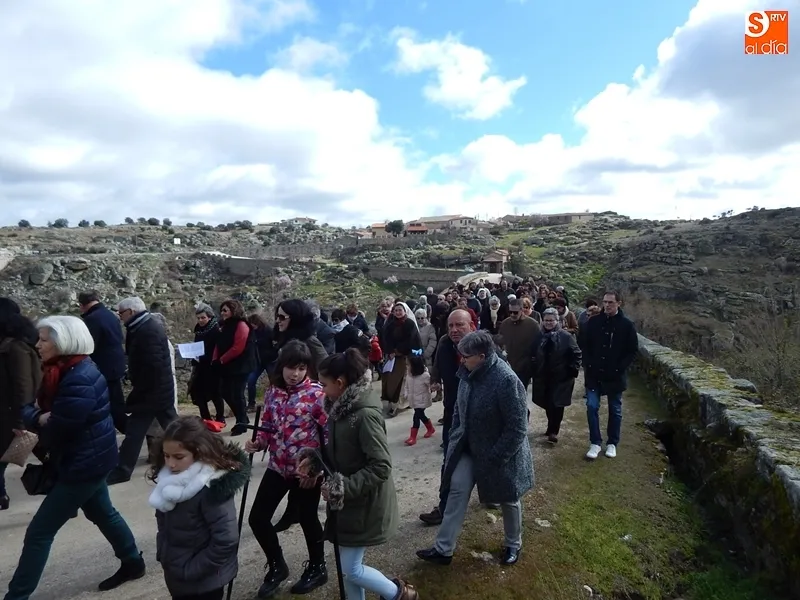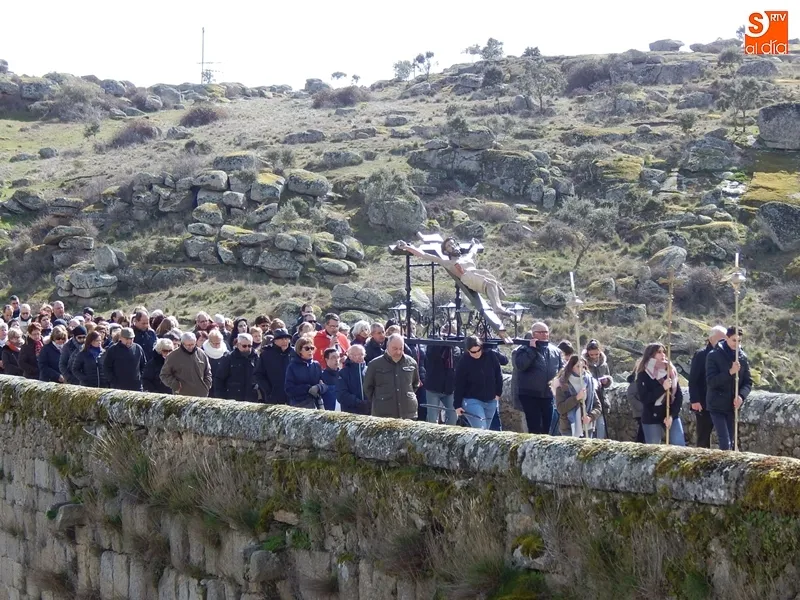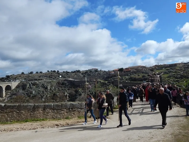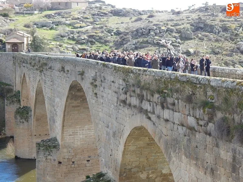 La imagen del Cristo de las Aguas, portada a hombros a lo largo de las 14 estaciones del Vía Crucis, ha cruzado el puente viejo de Ledesma, en una subida que parte desde la ermita de la Virgen del Carmen, donde permanecía desde el pasado Miércoles Santo.