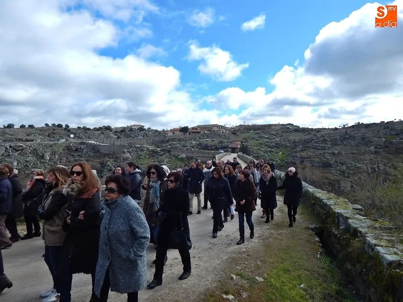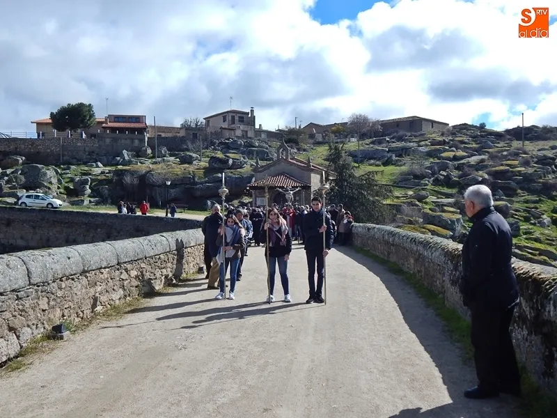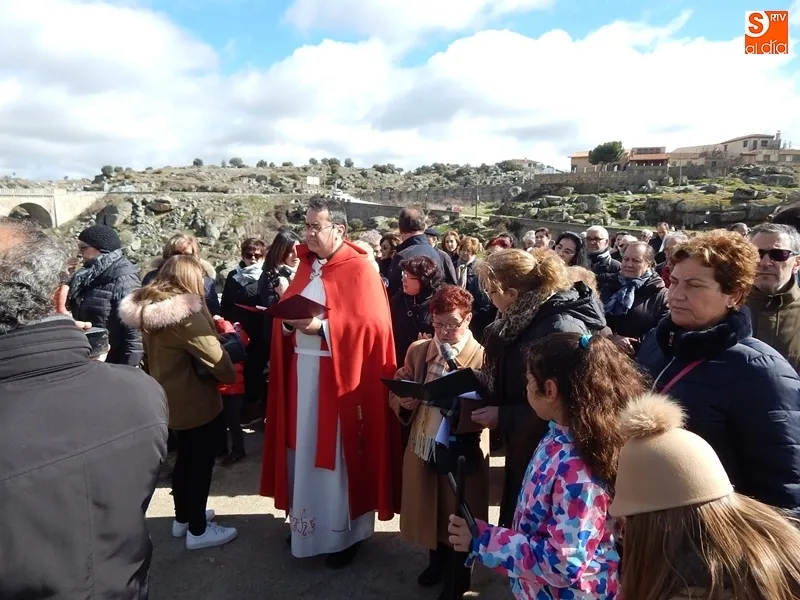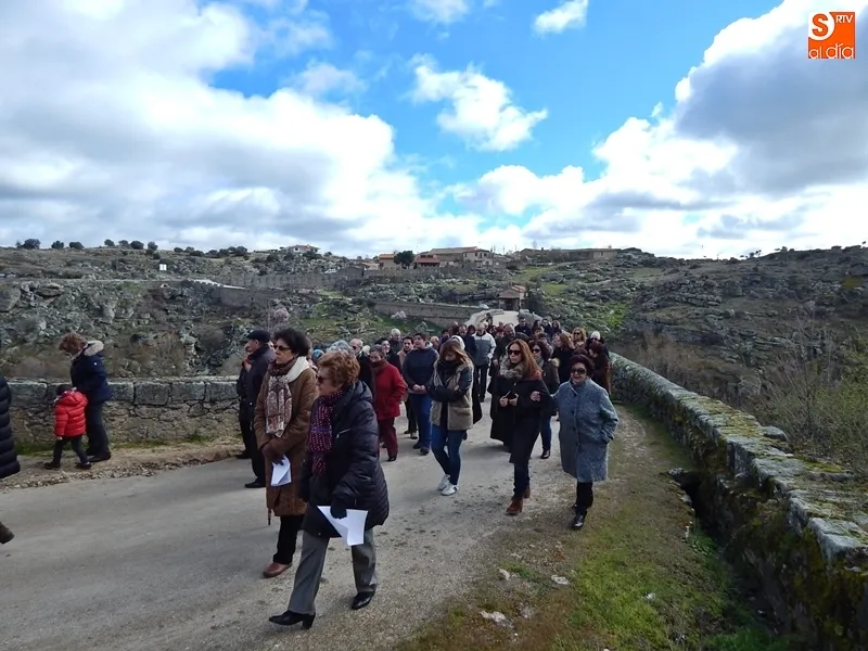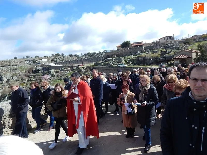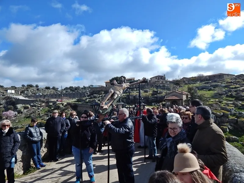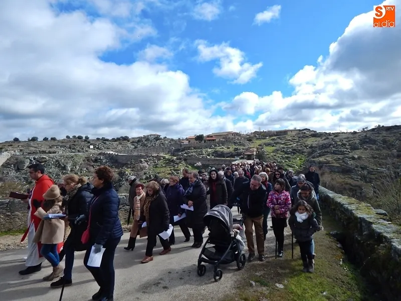 La imagen del Cristo de las Aguas, portada a hombros a lo largo de las 14 estaciones del Vía Crucis, ha cruzado el puente viejo de Ledesma, en una subida que parte desde la ermita de la Virgen del Carmen, donde permanecía desde el pasado Miércoles Santo.
