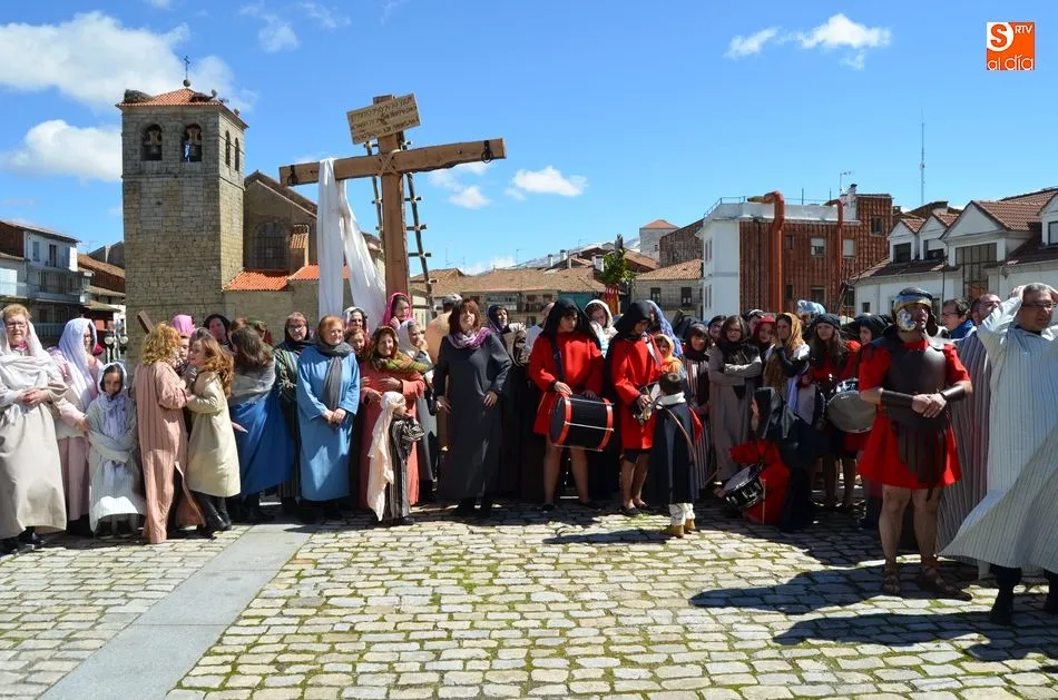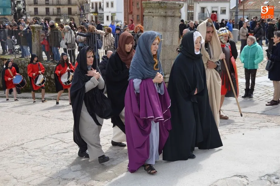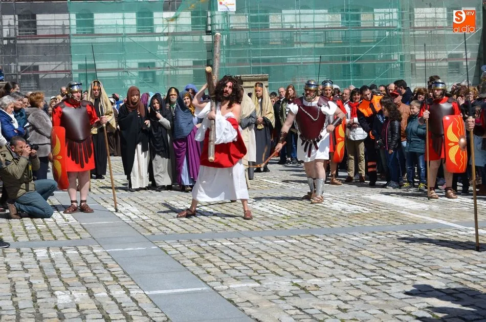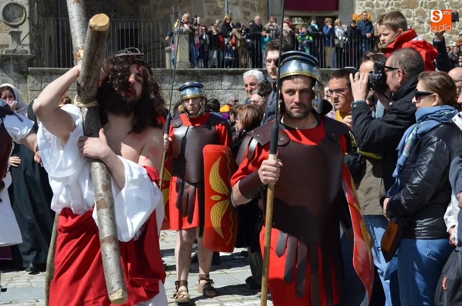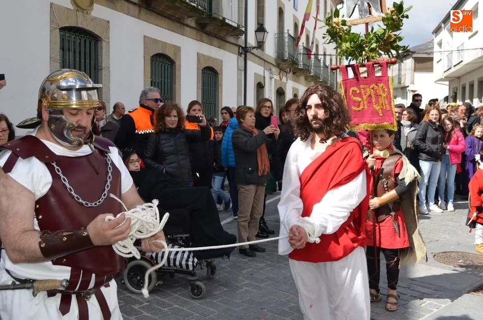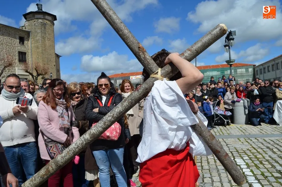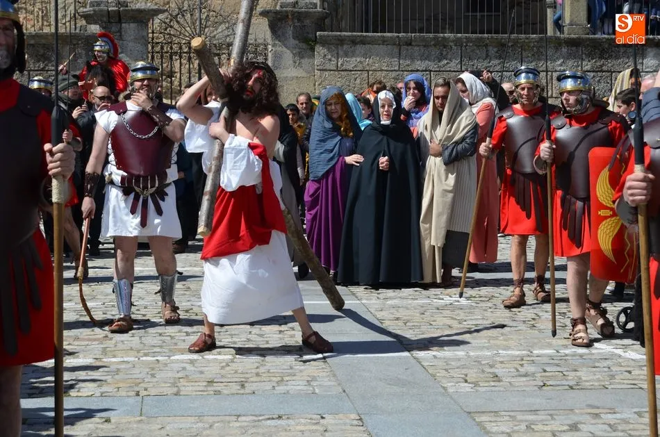 Hacia el medio día de Viernes Santo, el condenado emprende el camino del monte Calvario con una pesada cruz sobre los hombros, cuyo excesivo peso le hace sufrir tres caídas y tiene que ser ayudado por el Cirineo, durante este camino tiene lugar el encuentro con su Madre y con las Santas Mujeres. La Verónica apiadándose de él le limpia el rostro con un lienzo en el que quedan impresas las facciones de Jesucristo (La Santa Faz).