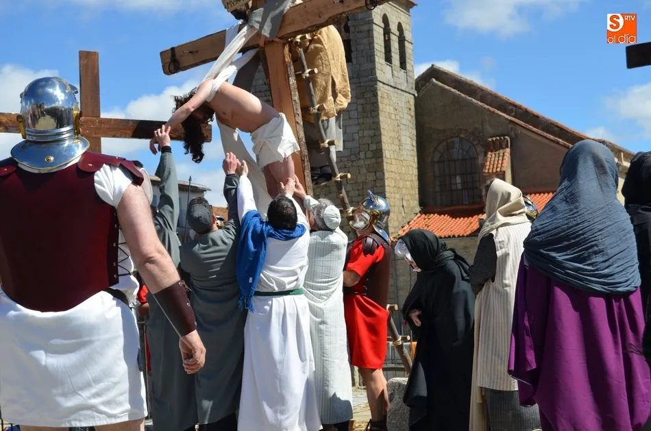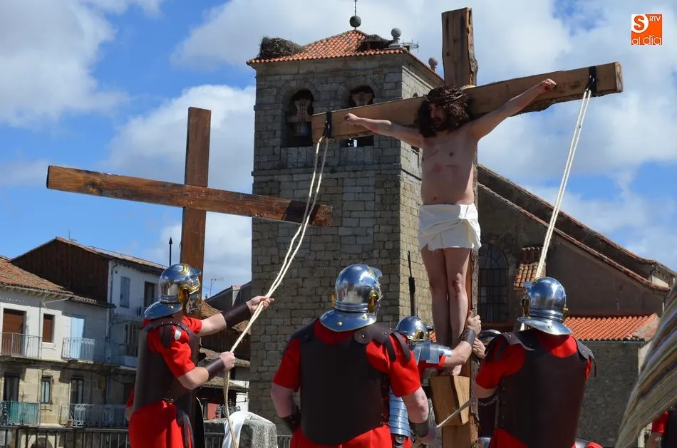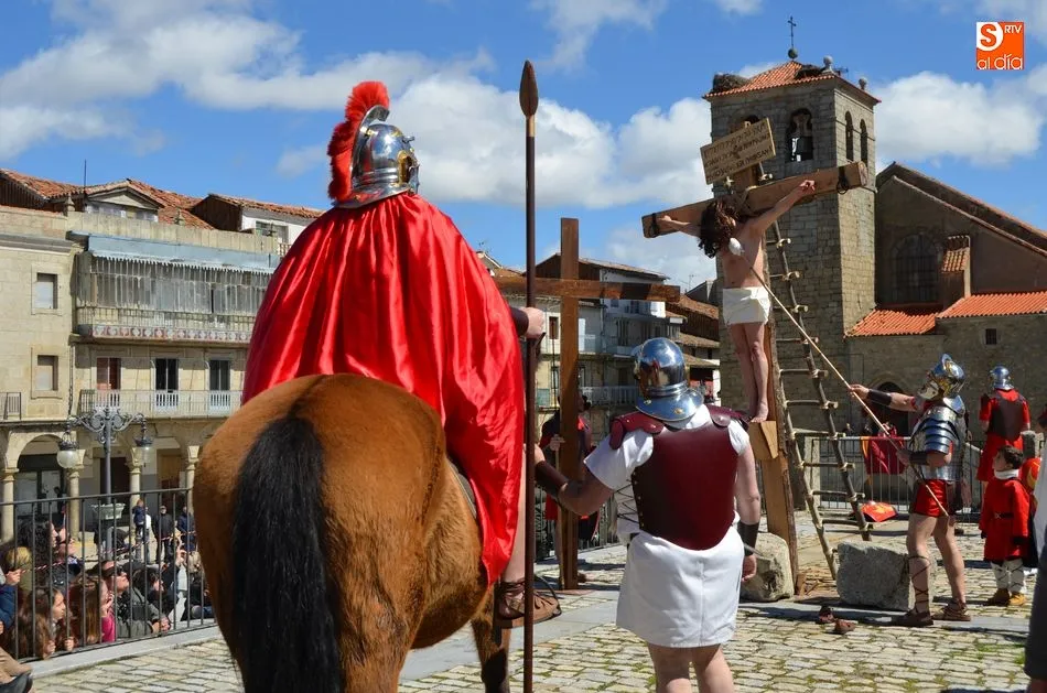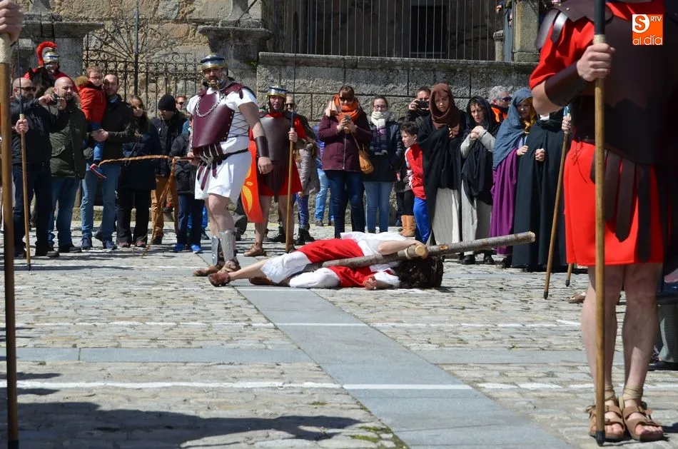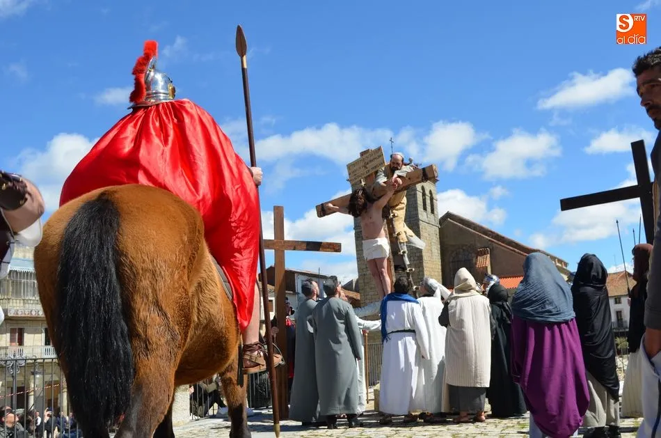 Al llegar a la cima del Gólgota (monte Calvario en hebreo), Jesús es crucificado en medio de dos ladrones, los soldados se reparten sus vestiduras, menos la túnica que es sorteada. A los pies de la cruz las tres Marías, su madre, la mujer de Cleofás y la Magdalena, junto a San Juan. Cuando expira, después de darle a beber vinagre y de ser atravesado por la lanza de Longinos para asegurar su muerte, el sol se eclipsa, el velo del templo se rasga, la tierra tiembla y muchos muertos resucitan.