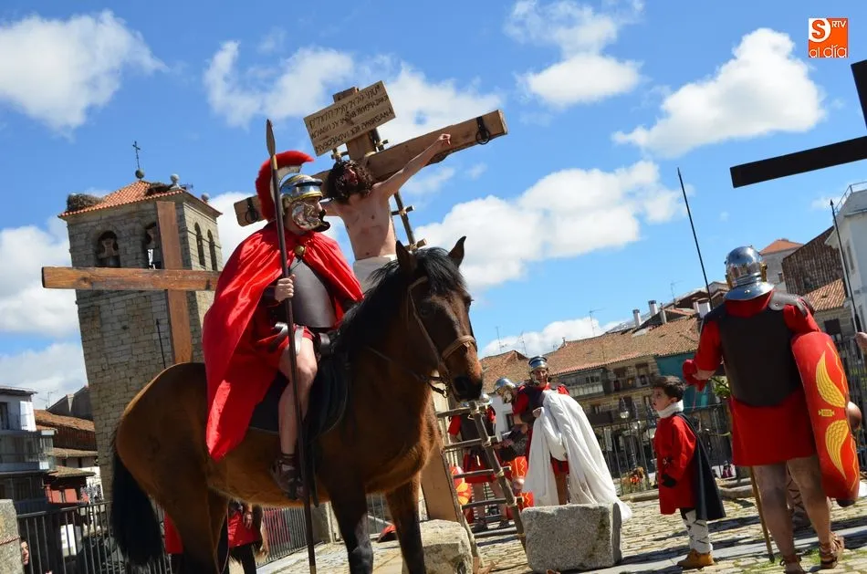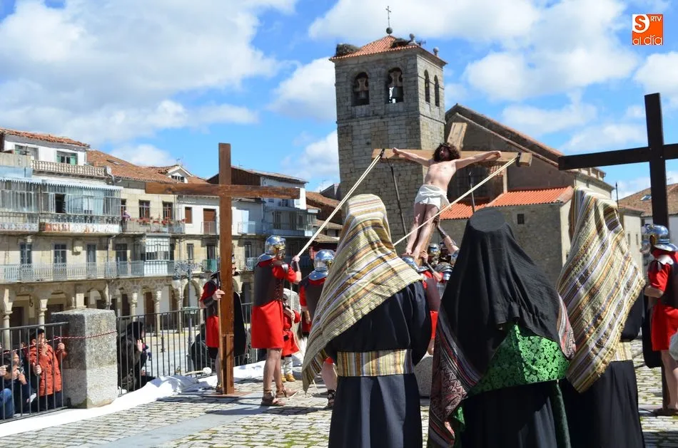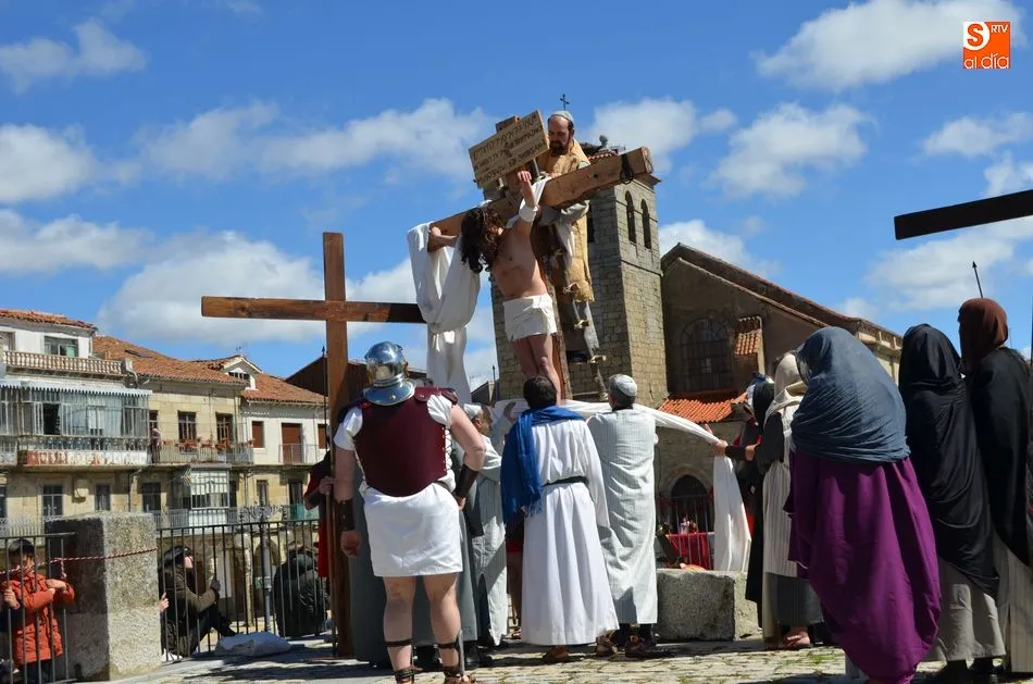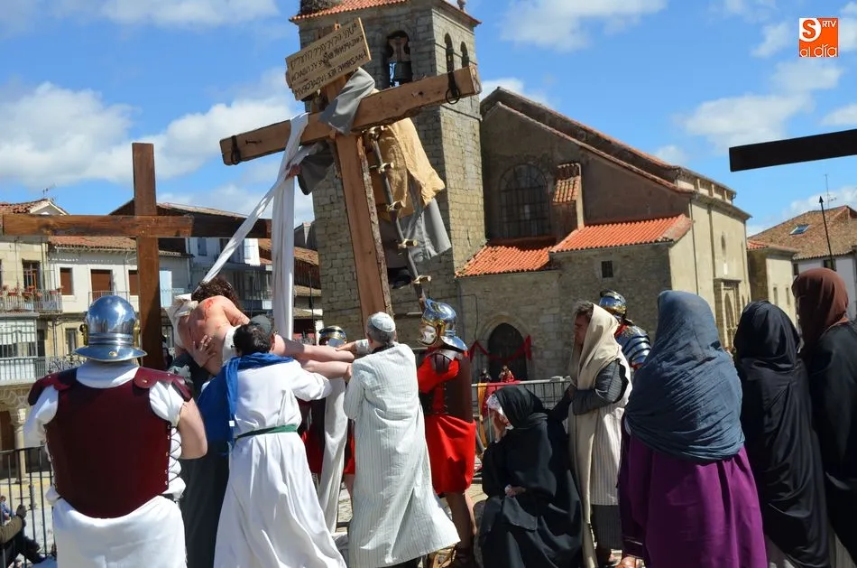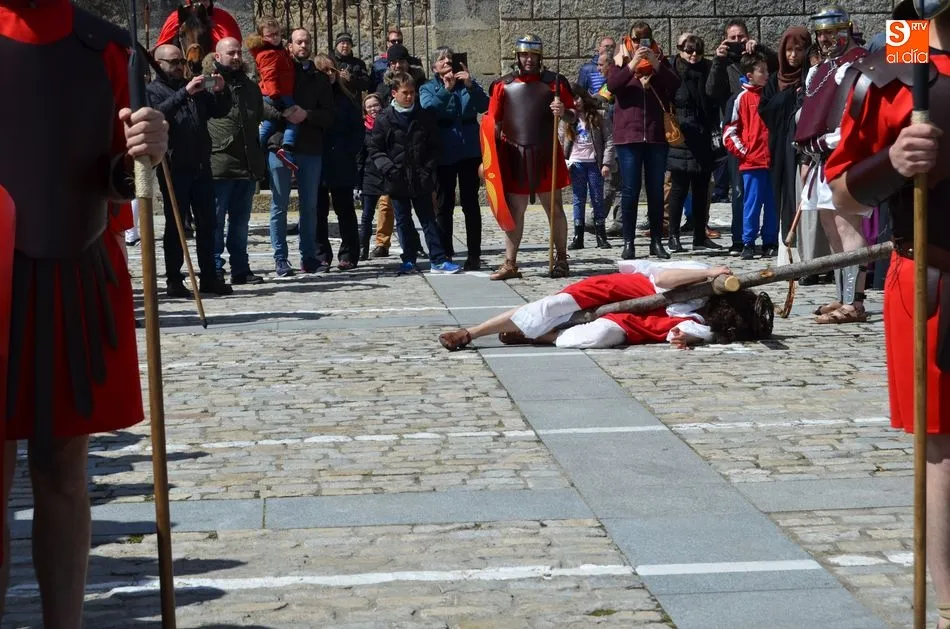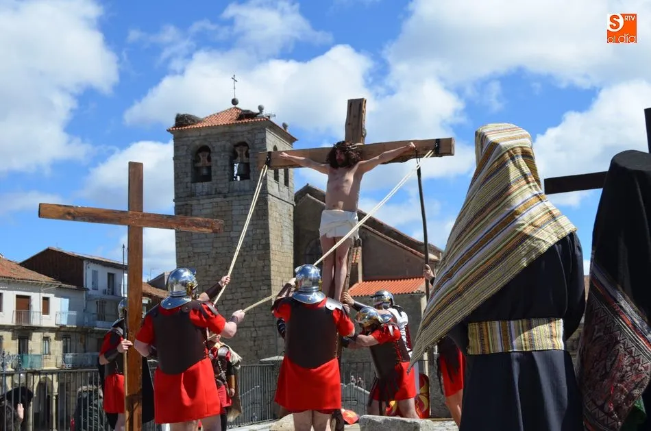 Al llegar a la cima del Gólgota (monte Calvario en hebreo), Jesús es crucificado en medio de dos ladrones, los soldados se reparten sus vestiduras, menos la túnica que es sorteada. A los pies de la cruz las tres Marías, su madre, la mujer de Cleofás y la Magdalena, junto a San Juan. Cuando expira, después de darle a beber vinagre y de ser atravesado por la lanza de Longinos para asegurar su muerte, el sol se eclipsa, el velo del templo se rasga, la tierra tiembla y muchos muertos resucitan.