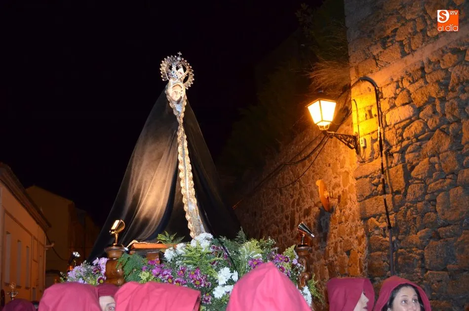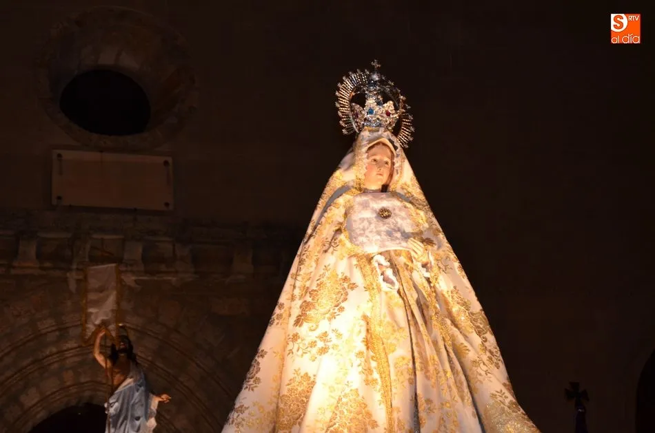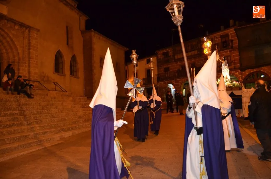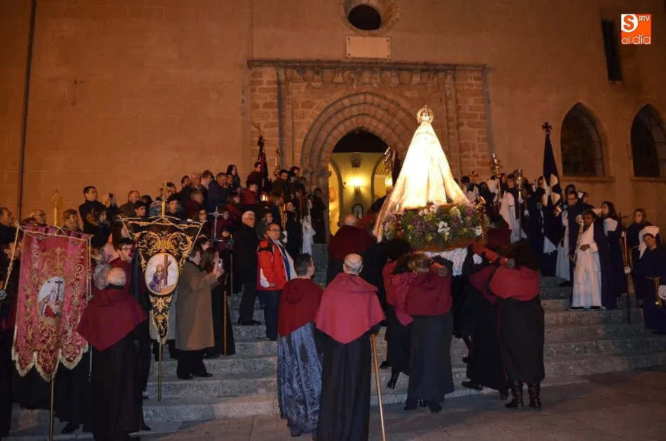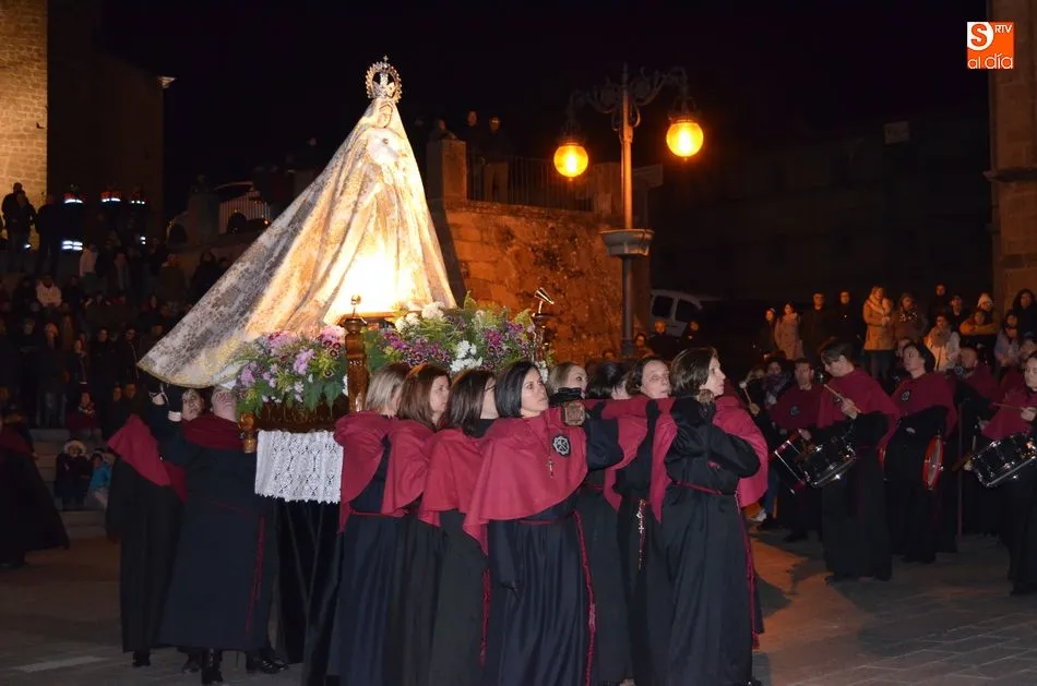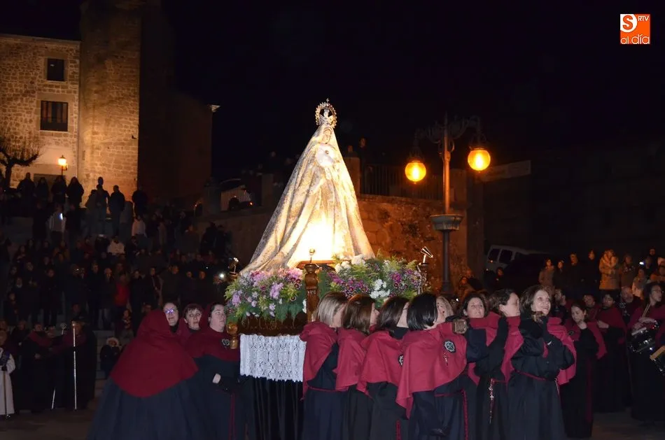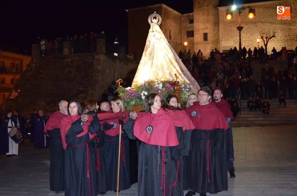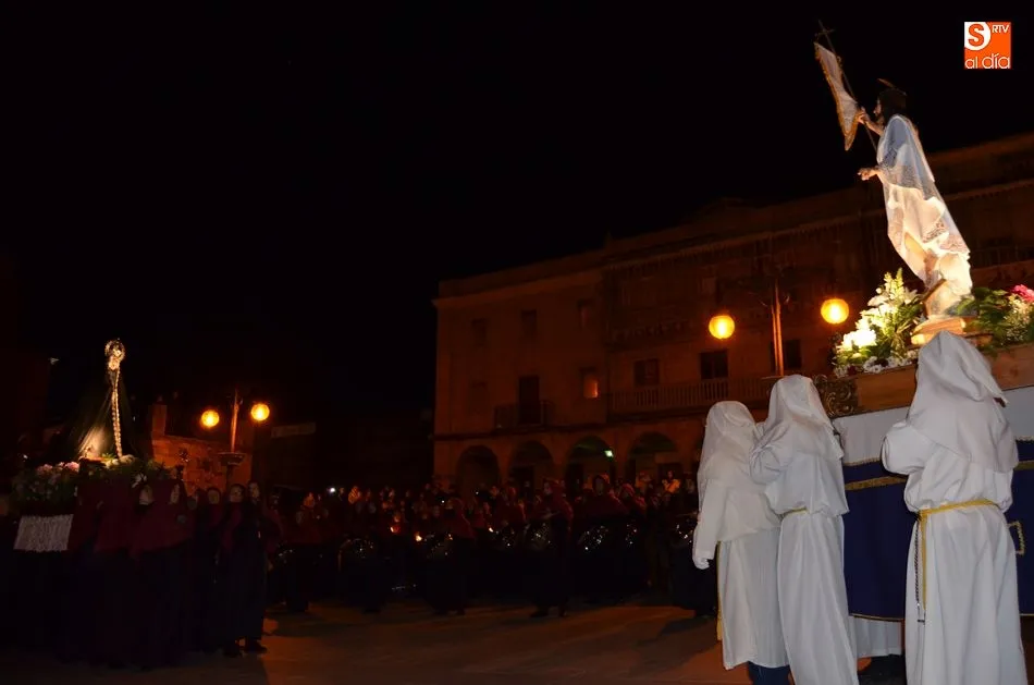 Pasadas las doce de la noche del Sábado de Gloria, Cristo Resucitado se encuentra con su Madre y el luto desaparece de sus vestiduras.