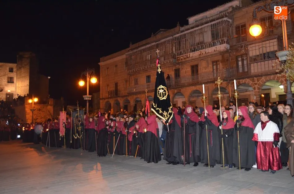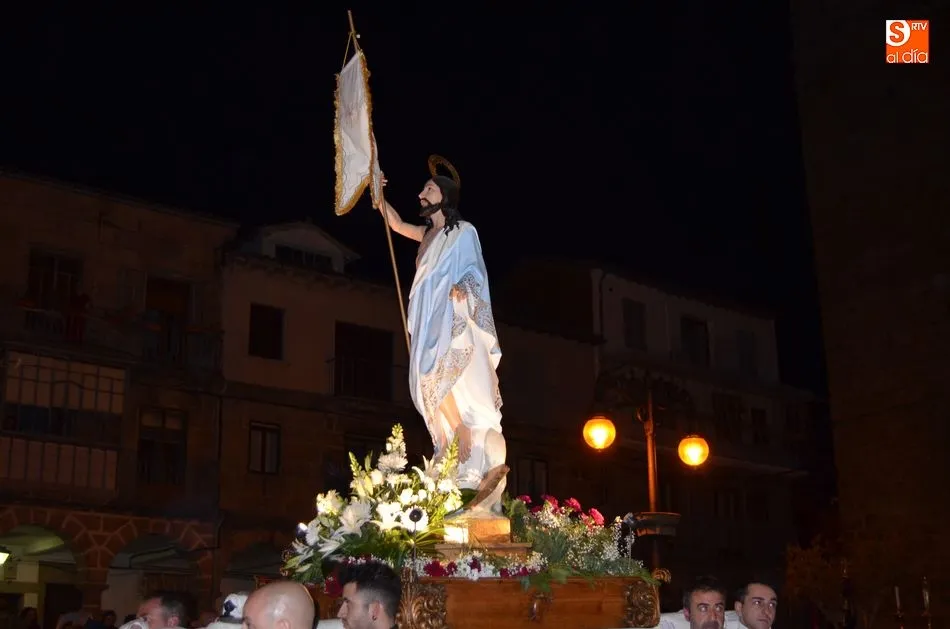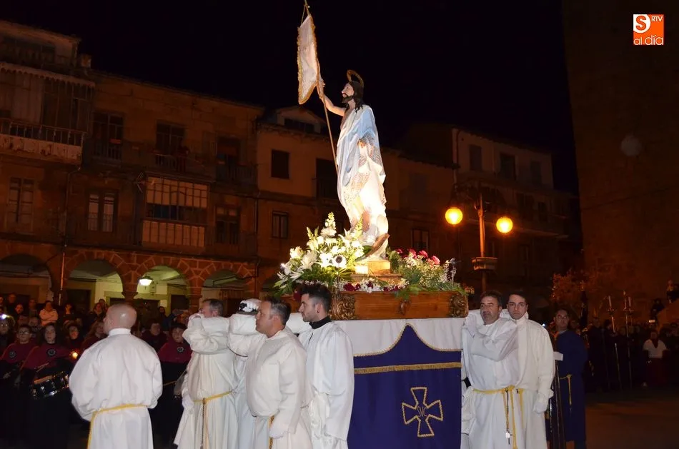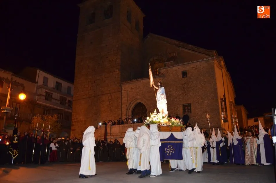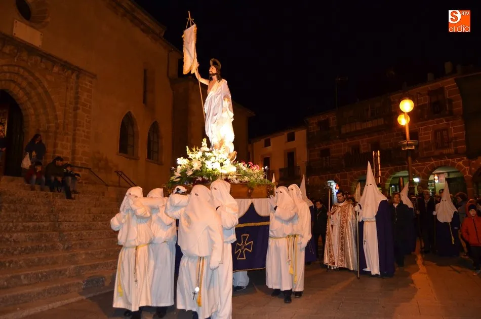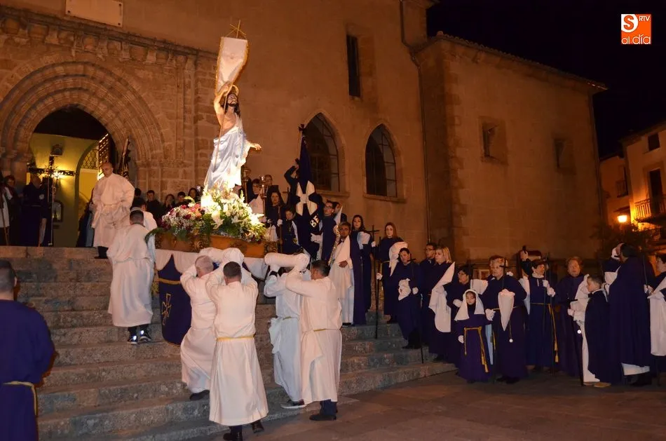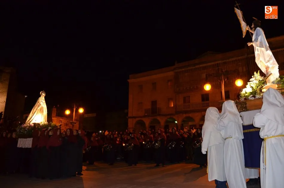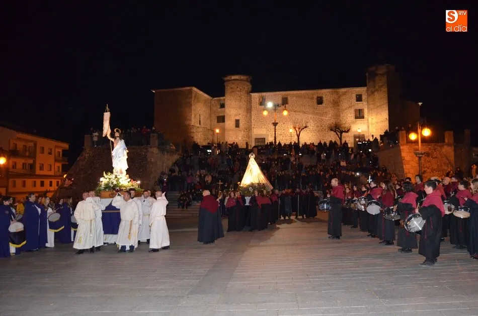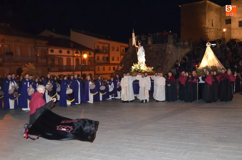 El Resucitado sale de la parroquia de San Juan Bautista, llevado en procesión por los cofrades de la Santa Vera Cruz, al mismo tiempo, de la iglesia de Santa María la Mayor parte la Virgen enlutada, acompañada de la Hermandad de Jesús Nazareno y Ntra. Sra. de las Angustias. Al llegar a la Plaza Mayor, la Seráfica Hermandad ya espera El Encuentro que cuando se produce hace caer el manto negro de la Virgen. Ambas figuras llevadas en andas, bailan al ritmo de los tambores que ya tocan a Gloria y ante ellas también las banderas muestran sus respetos.