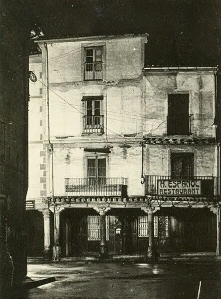 Imagen nocturna de los edificios de la plaza del Corrillo, donde estaba el café Español. Tomada desde la desaparecida calle de Arapiles dejando a la izquierda las casas de la isla de la Rúa.