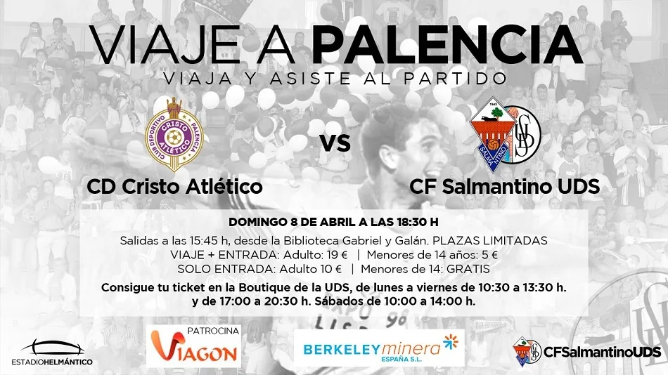 Con motivo del encuentro correspondiente a la trigésimo tercera jornada de Liga, en la que el CF Salmantino UDS visita el domingo al Cristo Atlético en la capital palentina, el club ha organizado un viaje hasta tierras castellanas para todos aquellos aficionados que deseen disfrutar del choque y animar al equipo.