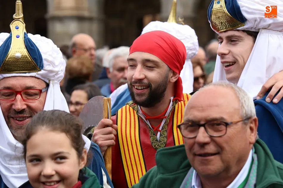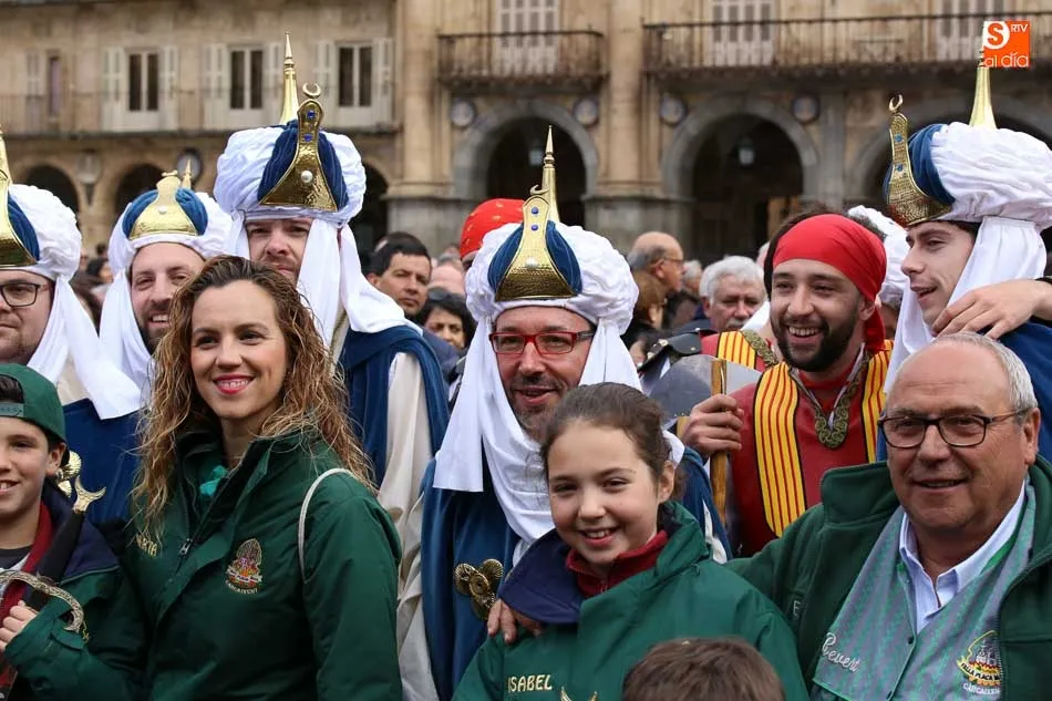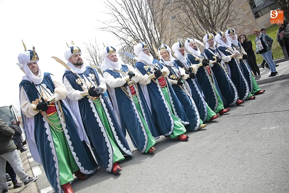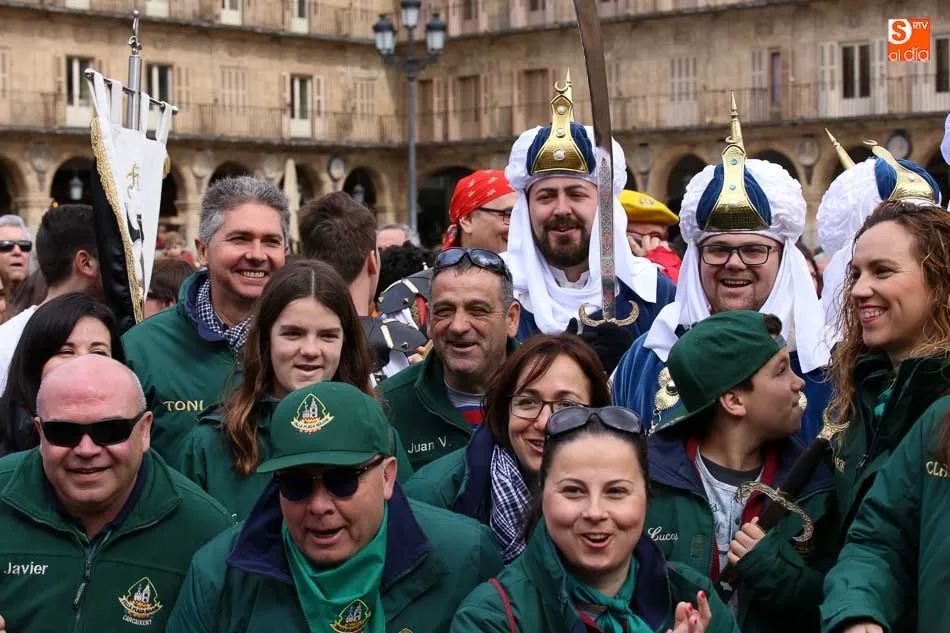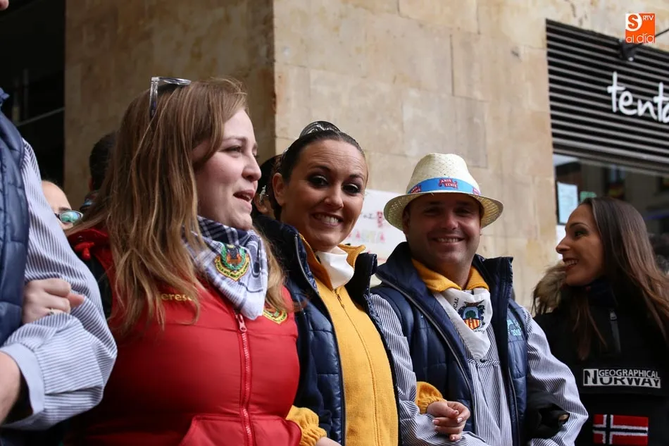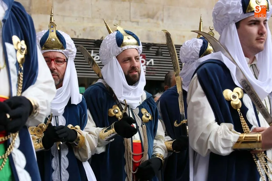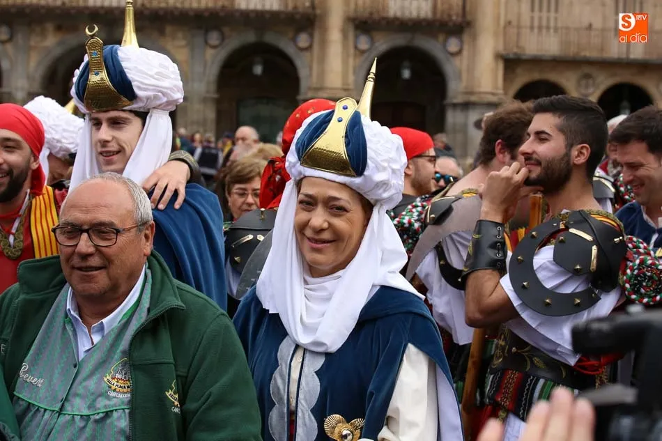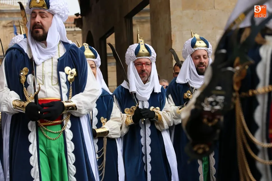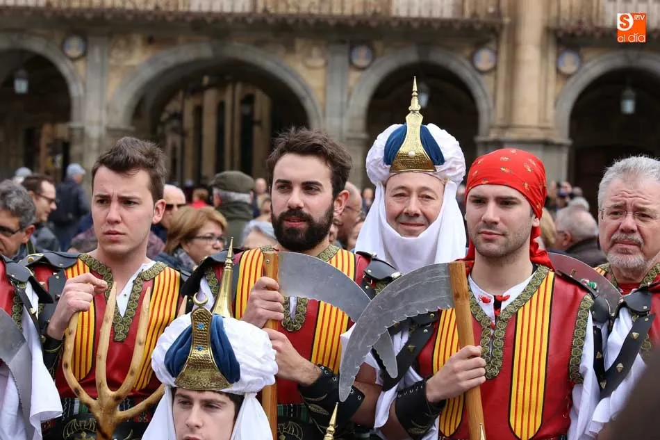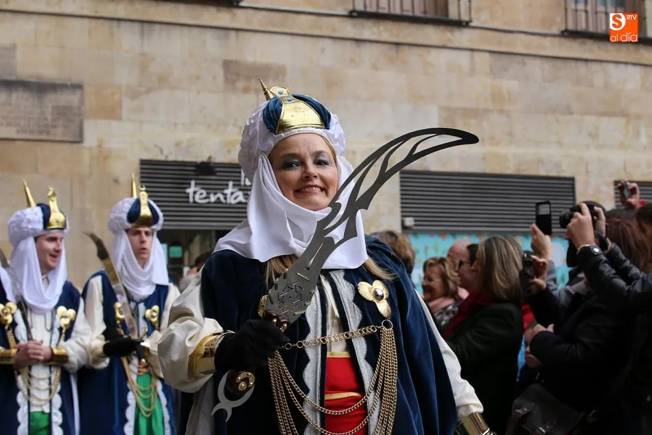 La Plaza Mayor de Salamanca se ha transformado este domingo en el escenario del singular y colorido desfile de Moros y Cristianos hasta la Vaguada de la Palma, dentro de las actividades más destacadas que durante todo el fin de semana han programado la Asociación Cultural Fallers Pel Mónhan para contagiar a Salamanca del ambiente festivo de las Fallas. Numeroso público se ha congregado en las calles por las que ha transitado el desfile.