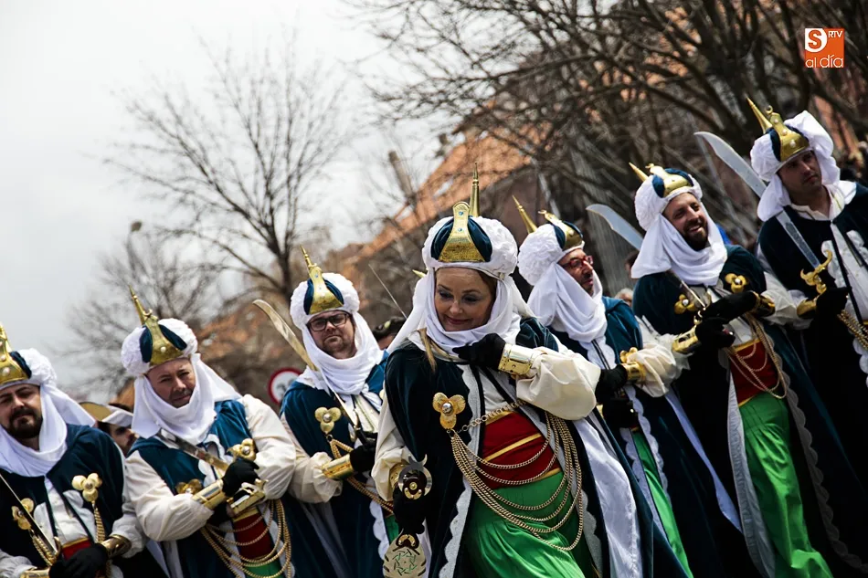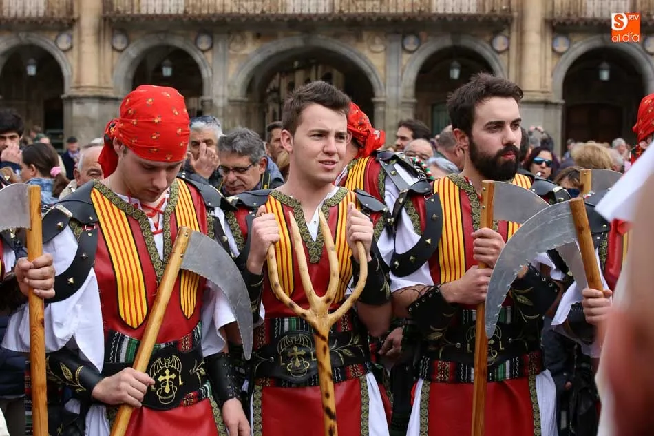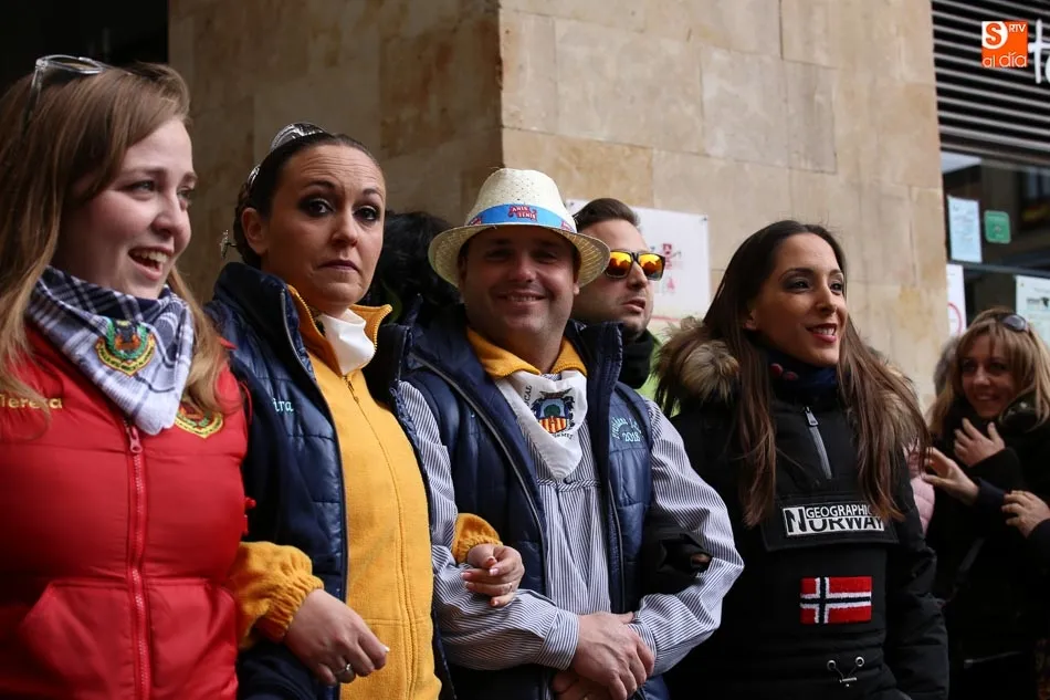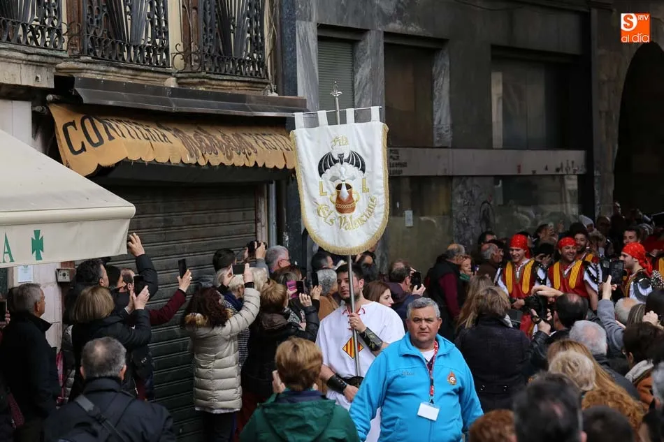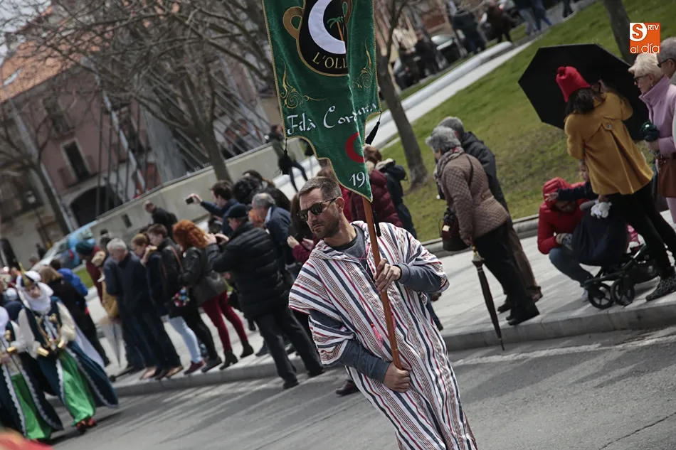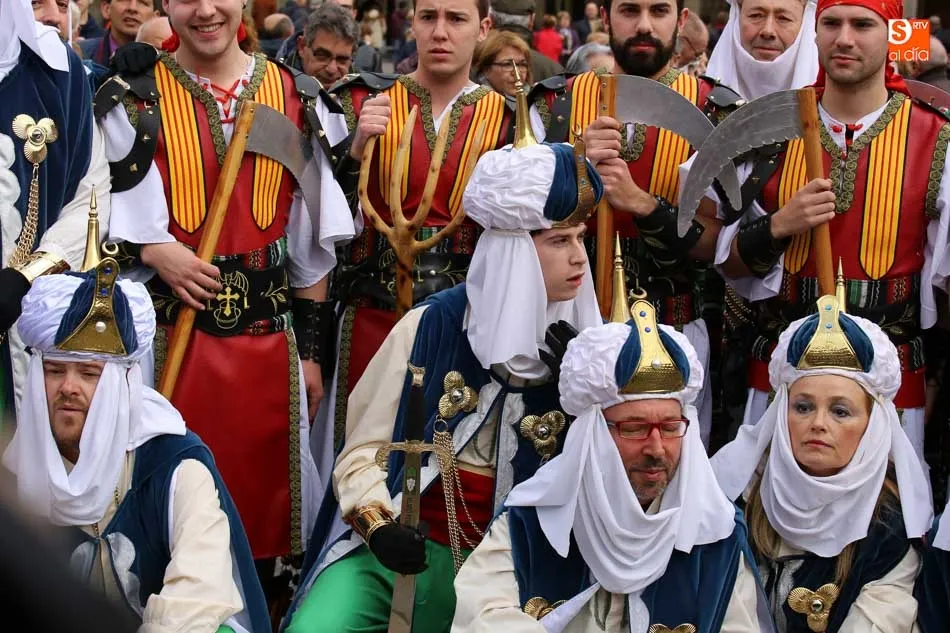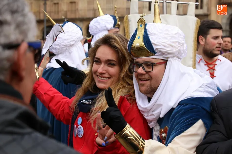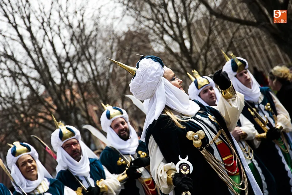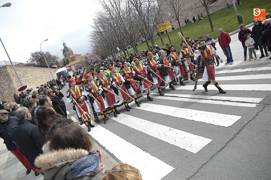 La Plaza Mayor de Salamanca se ha transformado este domingo en el escenario del singular y colorido desfile de Moros y Cristianos hasta la Vaguada de la Palma, dentro de las actividades más destacadas que durante todo el fin de semana han programado la Asociación Cultural Fallers Pel Mónhan para contagiar a Salamanca del ambiente festivo de las Fallas. Numeroso público se ha congregado en las calles por las que ha transitado el desfile.