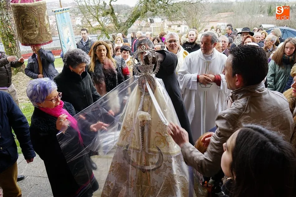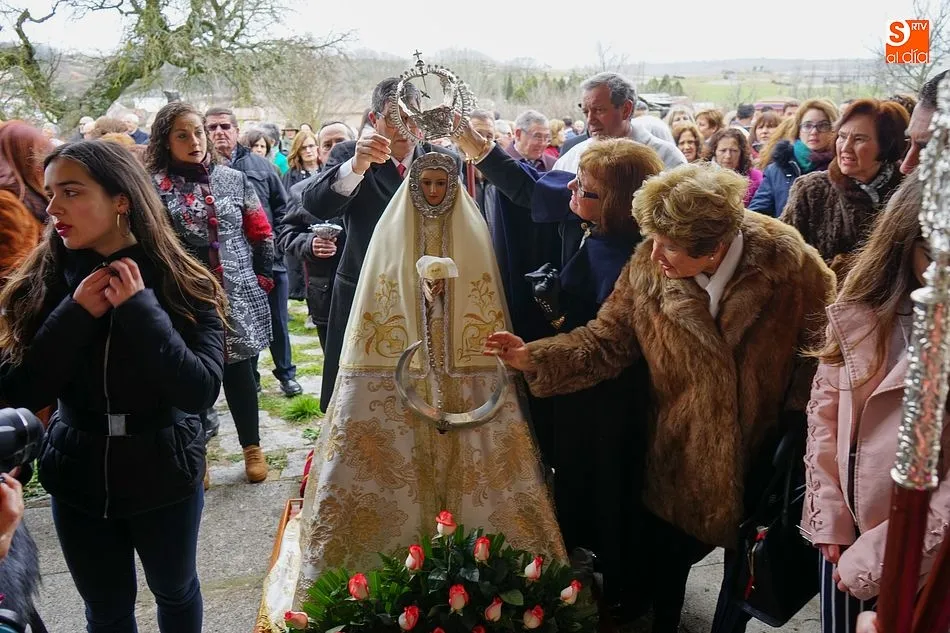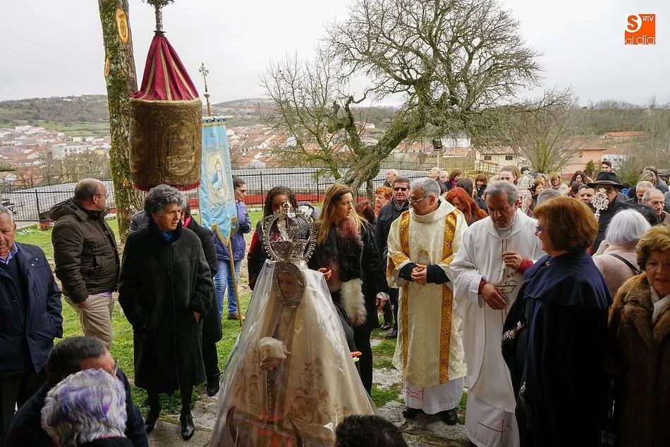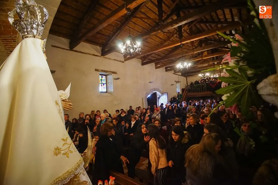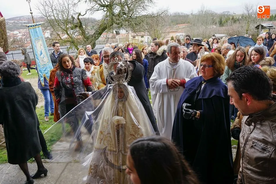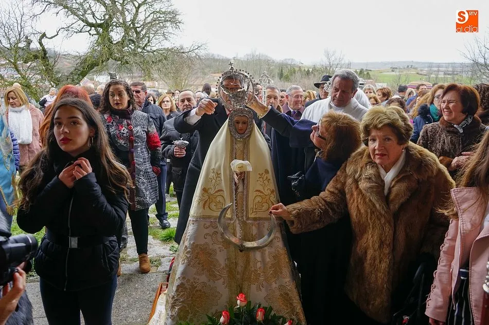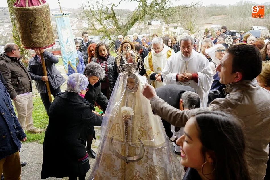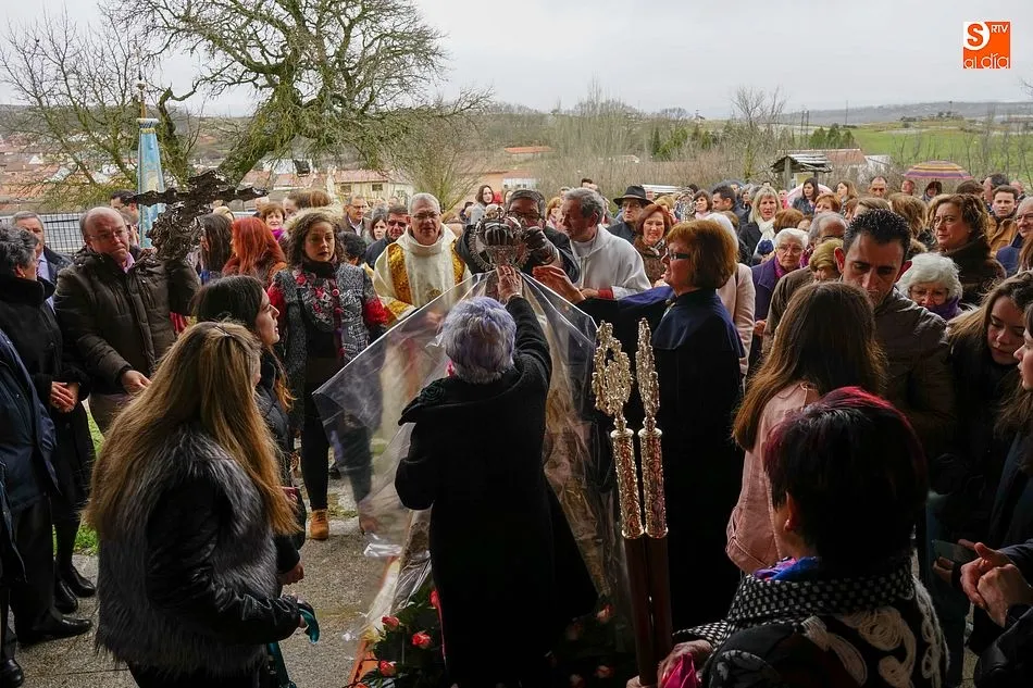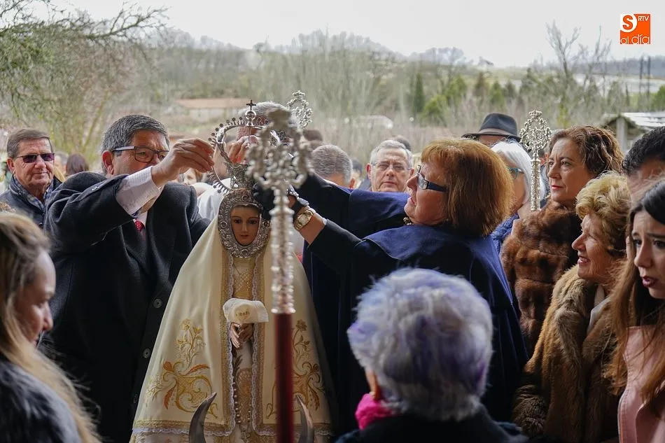 Cientos de fieles abarrotaron el pequeño templo aplaudiendo la llegada de la imagen, que fue preparada con sus mejores galas antes de ser devuelta al interior, donde se celebró la misa en su honor. Esta tarde, los vecinos cumplirán con la tradicional subasta en la puerta del templo junto a la recién instalada Picota de los Quintos.