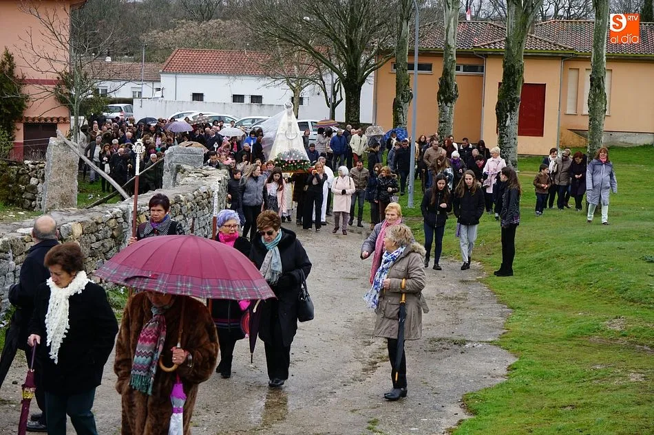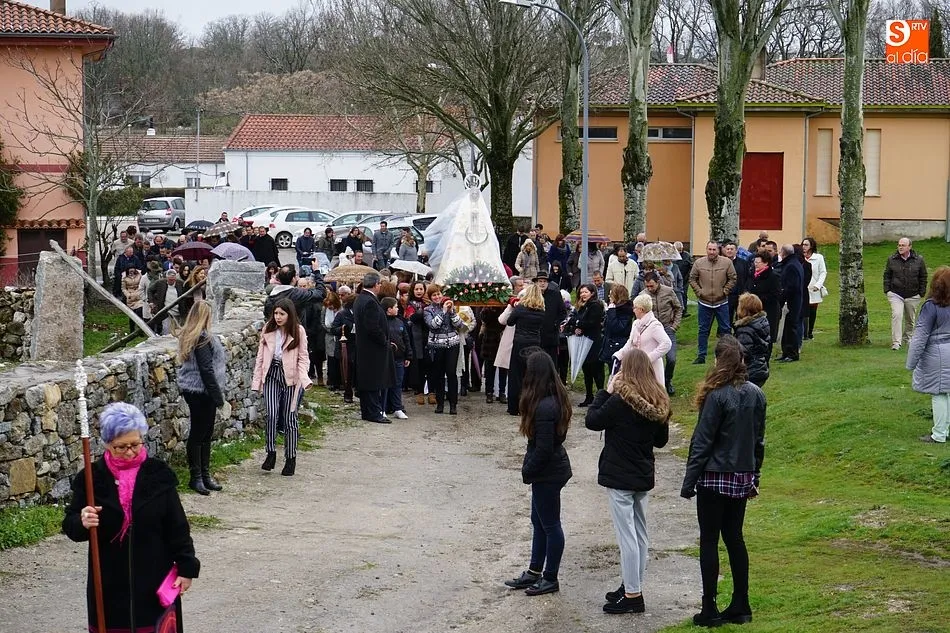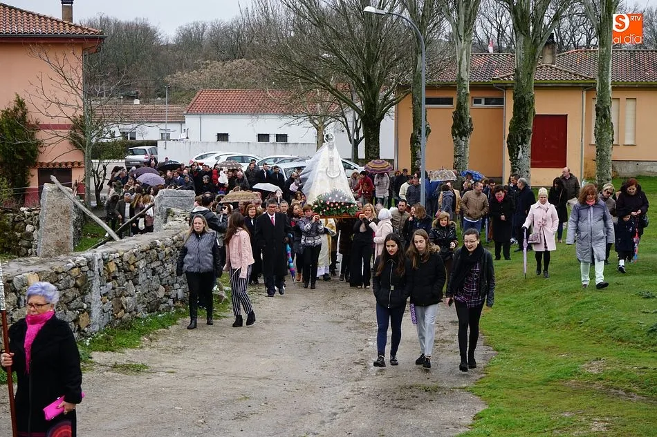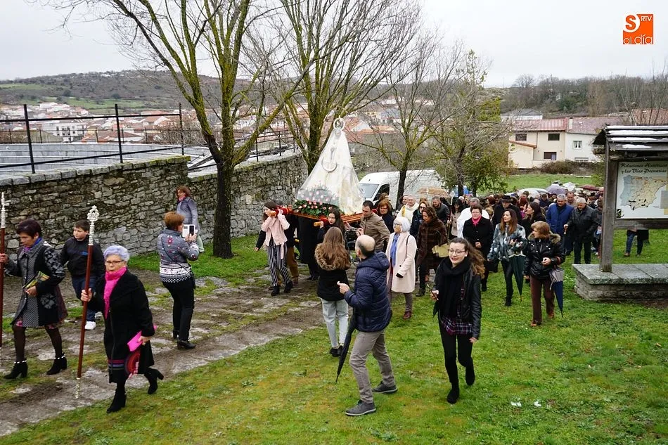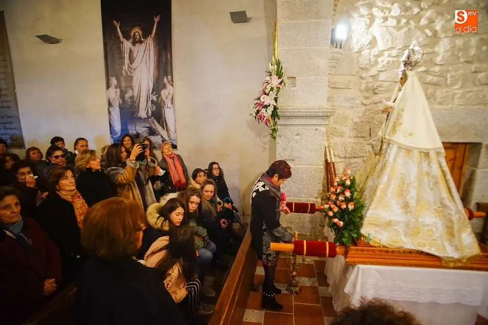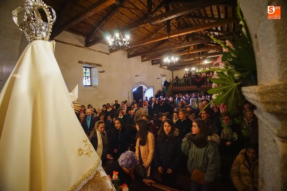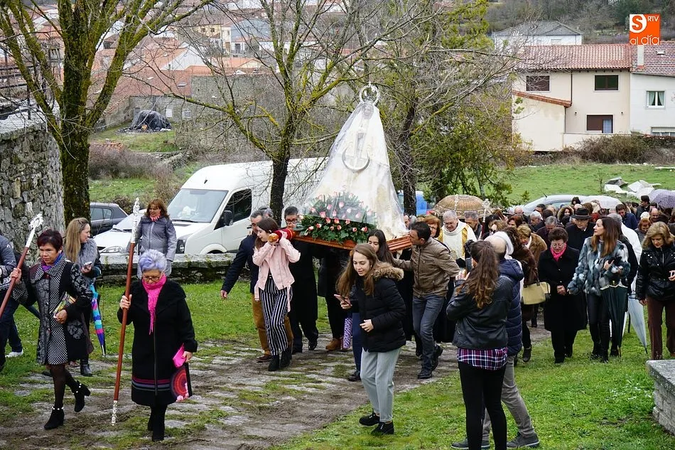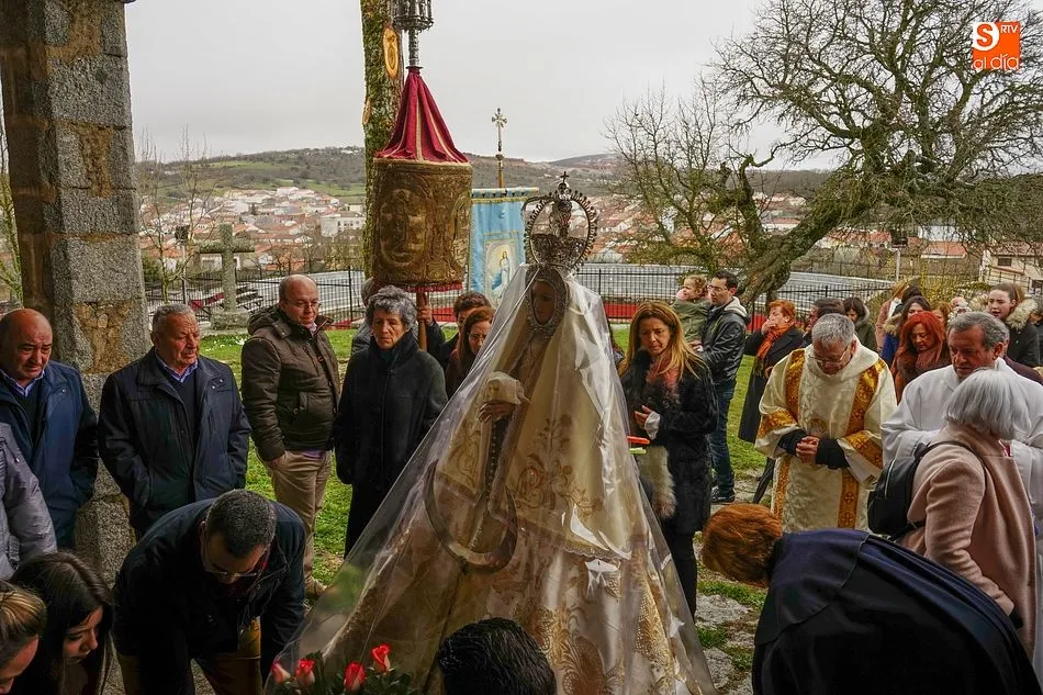Cientos de fieles abarrotaron el pequeño templo aplaudiendo la llegada de la imagen, que fue preparada con sus mejores galas antes de ser devuelta al interior, donde se celebró la misa en su honor. Esta tarde, los vecinos cumplirán con la tradicional subasta en la puerta del templo junto a la recién instalada Picota de los Quintos.