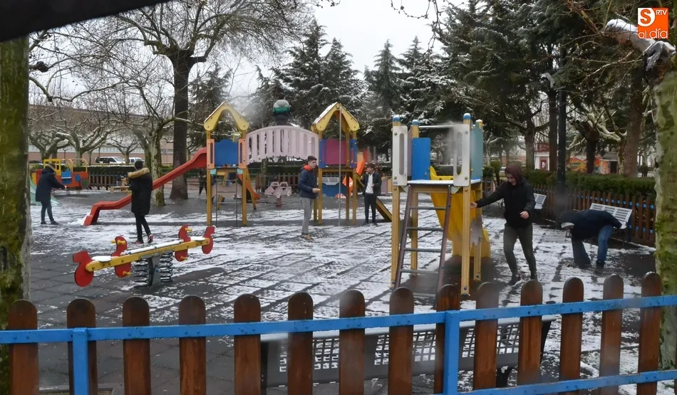 A la hora del recreo, los alumnos de los institutos se estuvieron lanzando bolas de nieve en el Parque de La Glorieta y en las calles anexas, ya que en esos momentos todavía aguantaba parte de la capa blanca, que no fue tan intensa como en marzo, pero que ha aguantado hasta una hora más o menos similar.