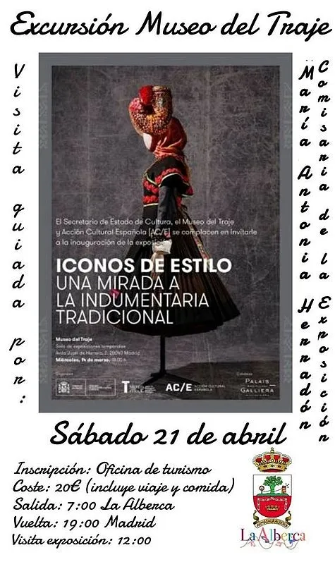 Los interesados en participar en la excursión al Museo del Traje pueden inscribirse en la Oficina de Turismo de La Alberca. El viaje del 21 de abril incluye comida, tiene un coste de 20 euros y partirá de la localidad serrana a las 07:00 horas, mientras que se regresará desde Madrid a las 19:00. La visita tendrá lugar a las 12:00 horas del mediodía en el citado museo. La muestra es de entrada libre y está disponible hasta el 3 de junio.